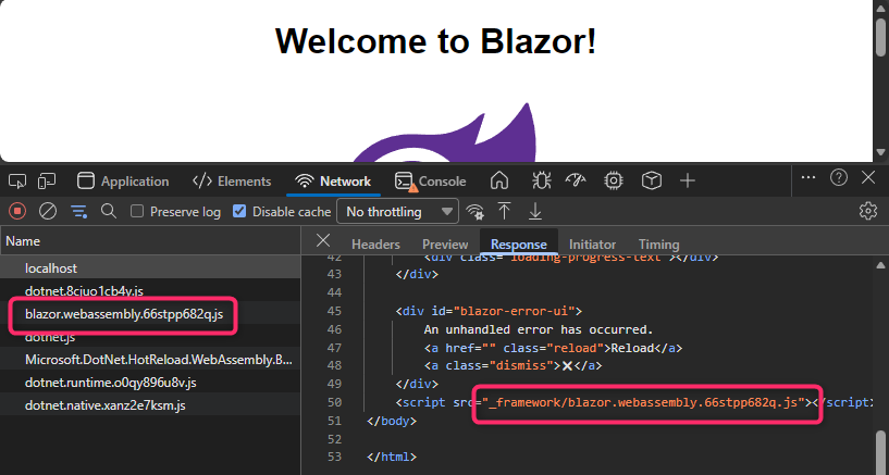 以上の処置を済ませて、dotnet run してみると、たしかにフィンガープリントが付け足されたファイル名にフォールバックページが置換されており、そのフィンガープリント付きのファイル名で blazor.webassembl.js ファイルが読み込まれていることも確認できました。