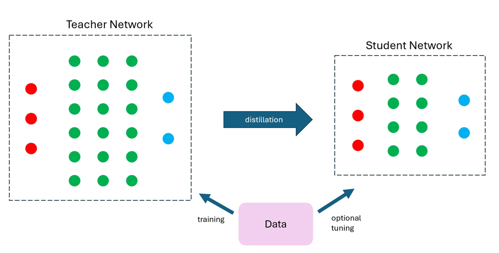 左の大きな教師ネットワークが持つ知識を抽出(distillation)し、右の小さな生徒ネットワークに転送します。これにより、生徒モデルは教師モデルに近い精度を保ちつつ、計算資源を大幅に節約できます。