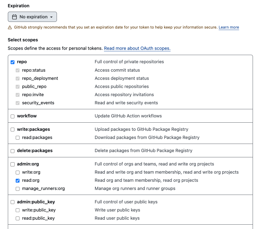 GitHub CLIでチームメンバーを取得するには、以下のようにPersonal Access Token (classic) を発行し、権限を適切に付与する必要があります。