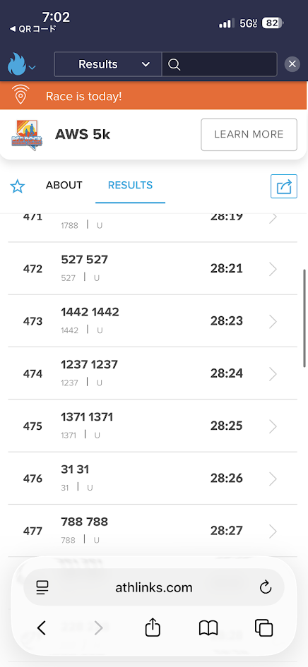 ゼッケンについているQRコードを読み込めば、タイムと順位が出てきます。