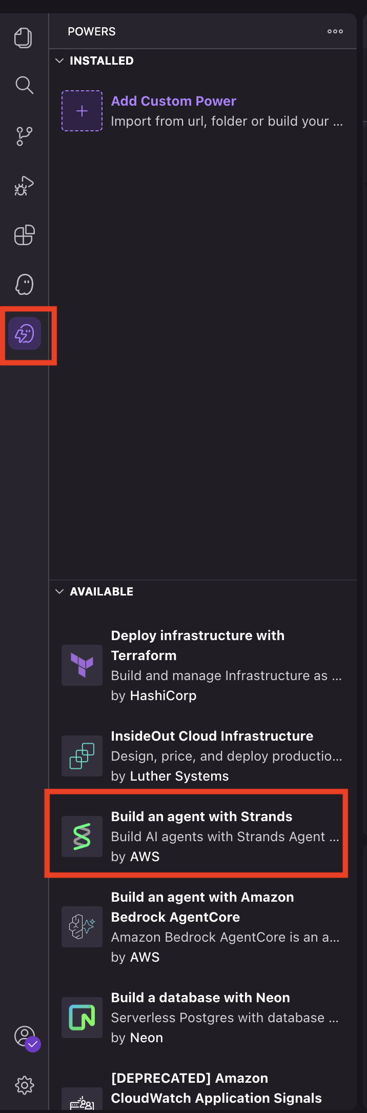 下のAvailableに今すぐ使えるPowersが出てきますので、今回はStrandsAgentsを入れてみましょう。