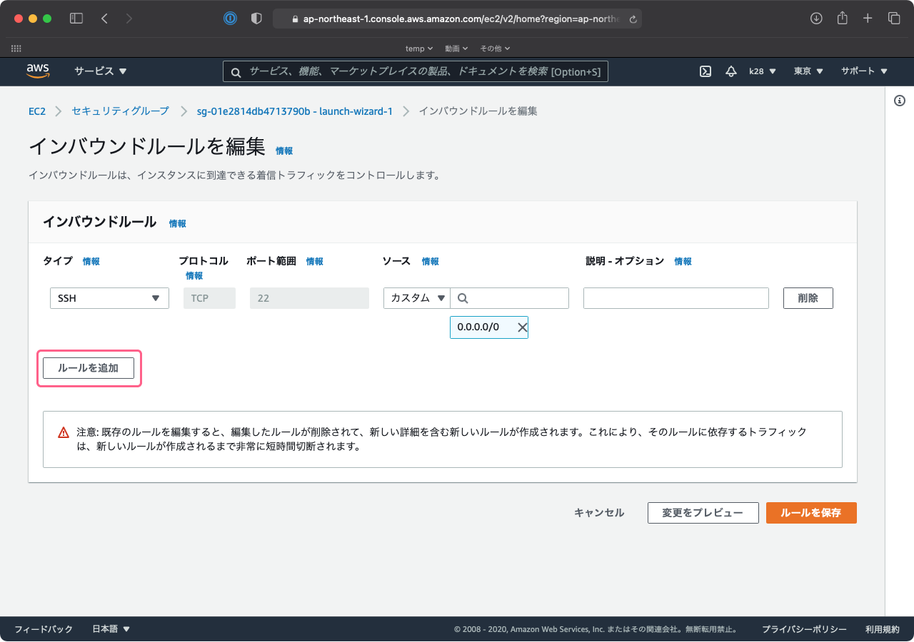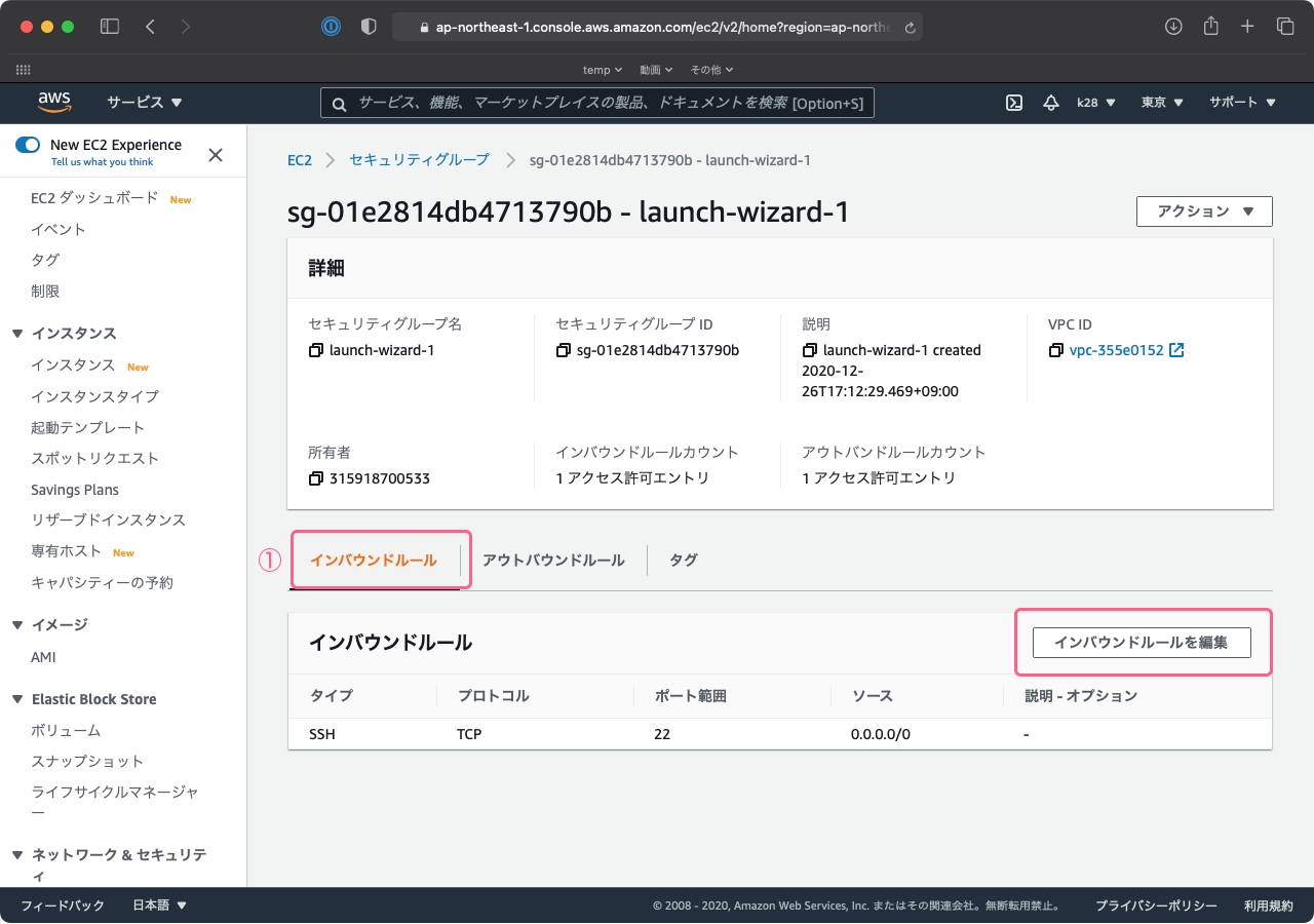 いつも忘れがちな作業ですがセキュリティグループからアクセスしたいポートを開放する必要があります。