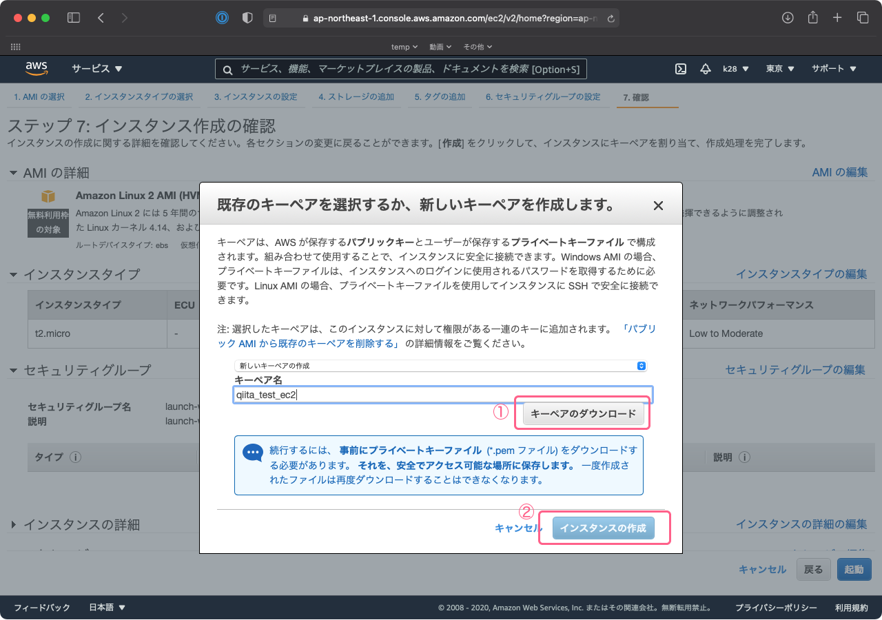 (今回はテスト立ち上げなので無料枠ありのt2.micro)