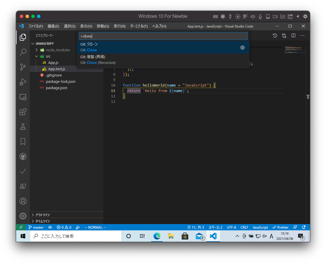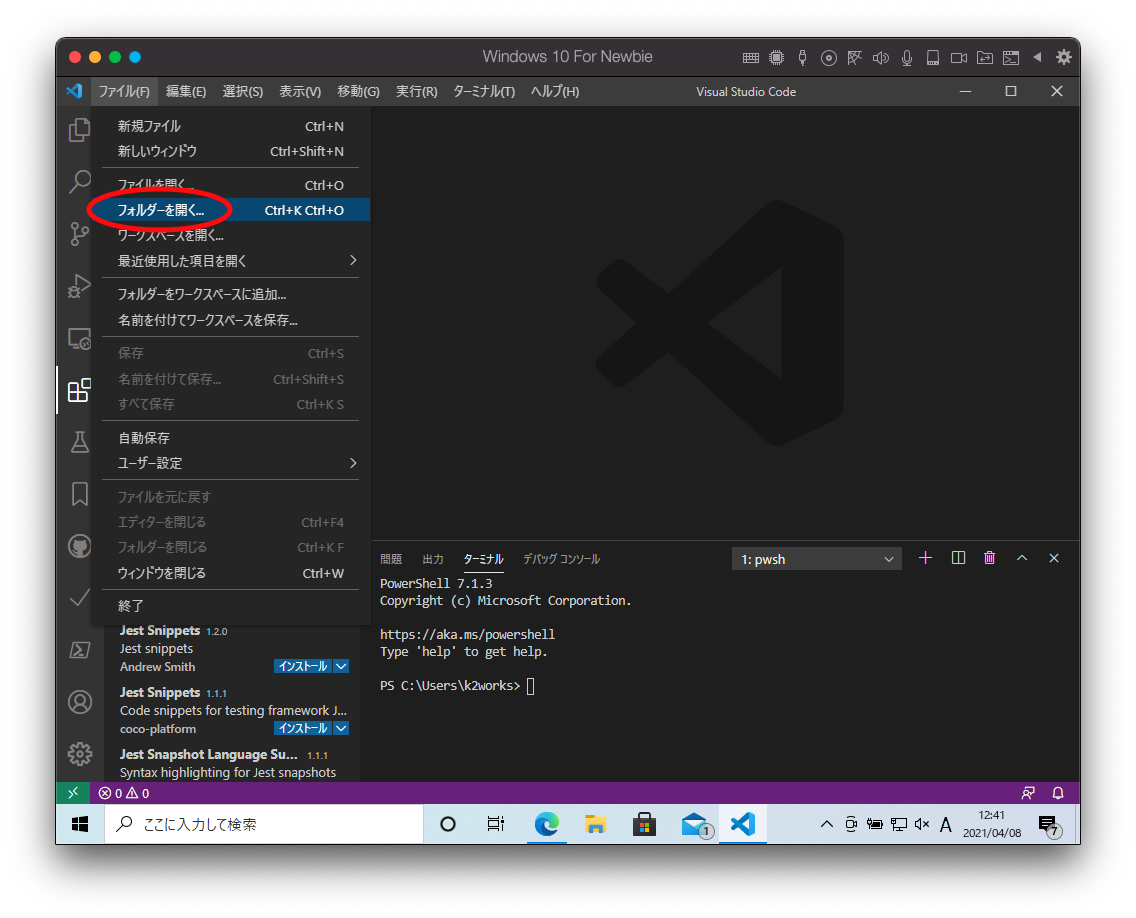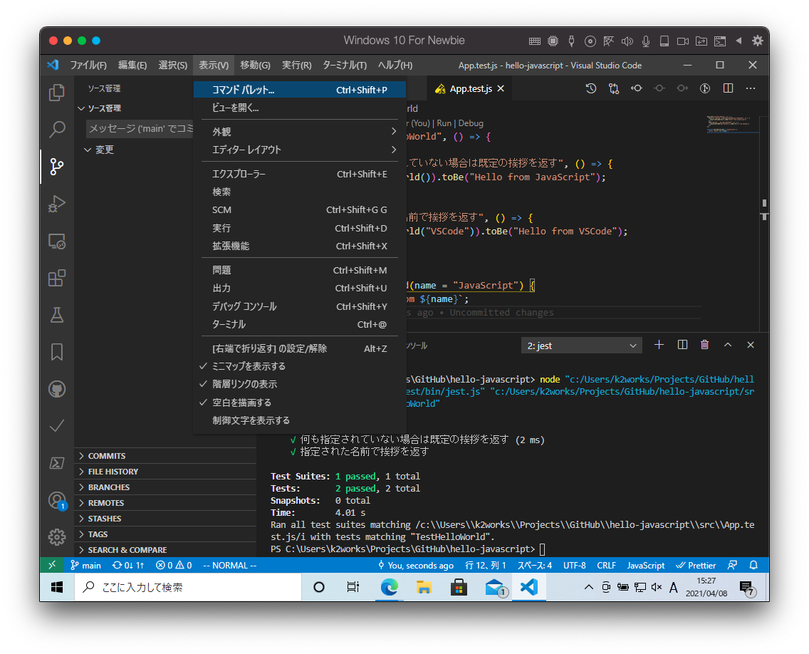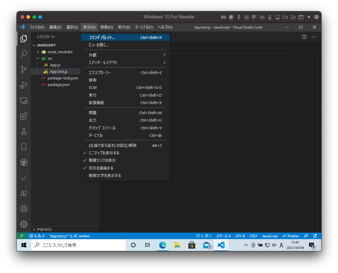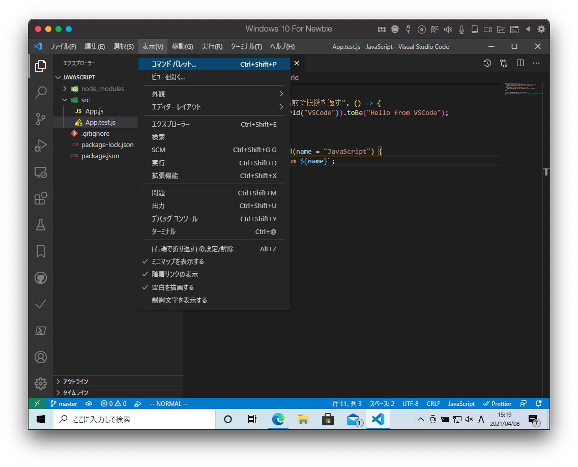 続いてVSCodeに戻り、表示 メニューから コマンドパレット を選択します。