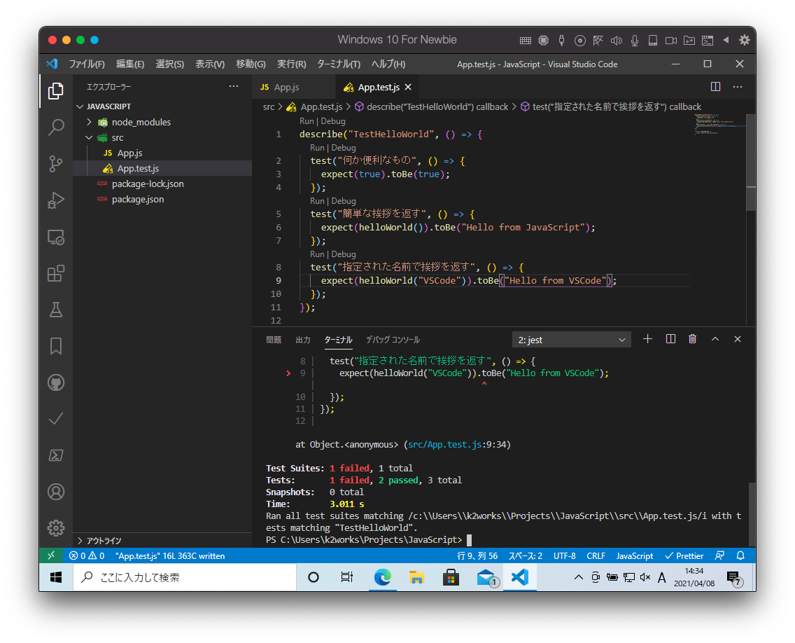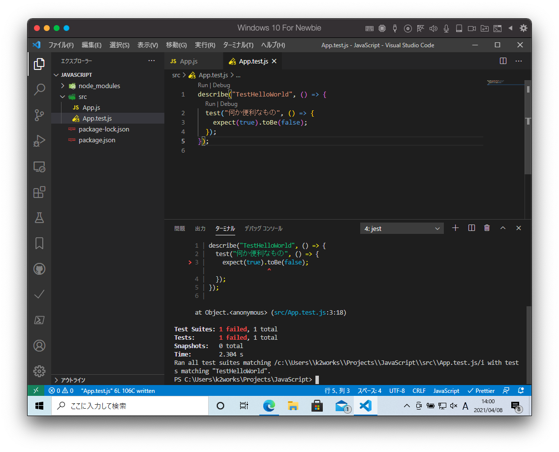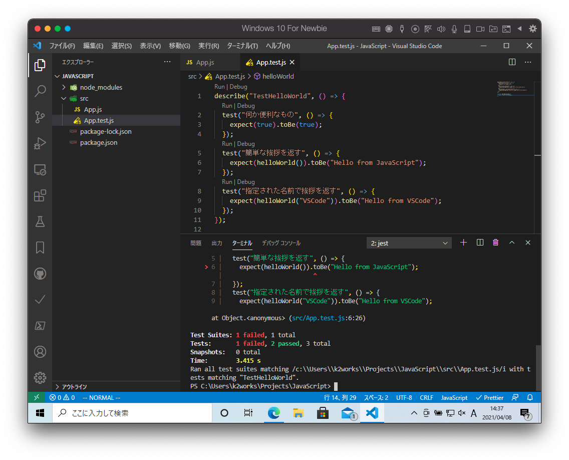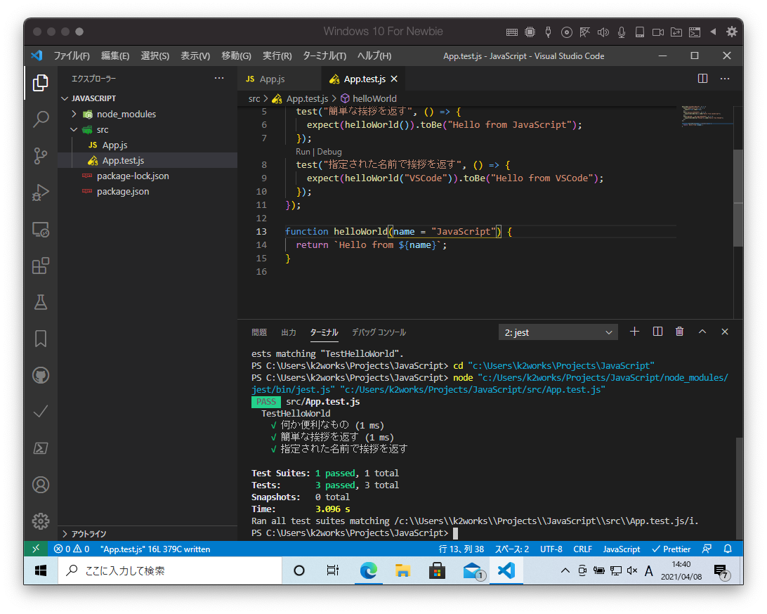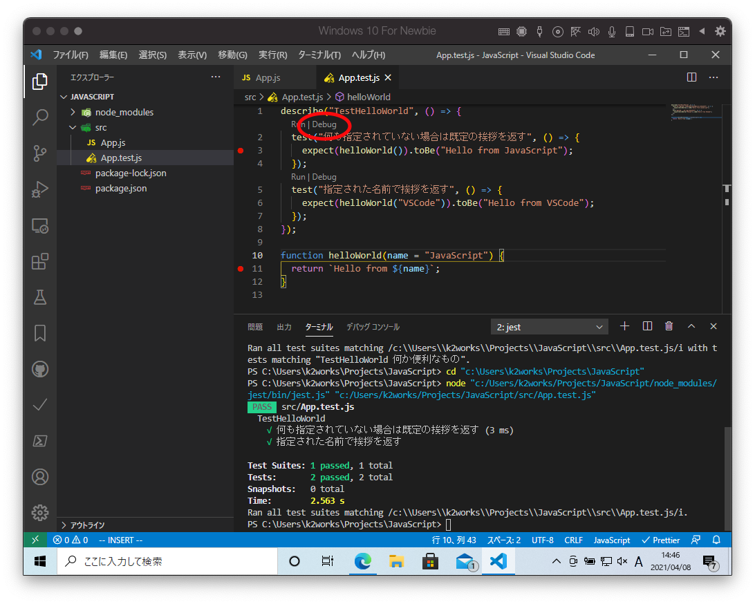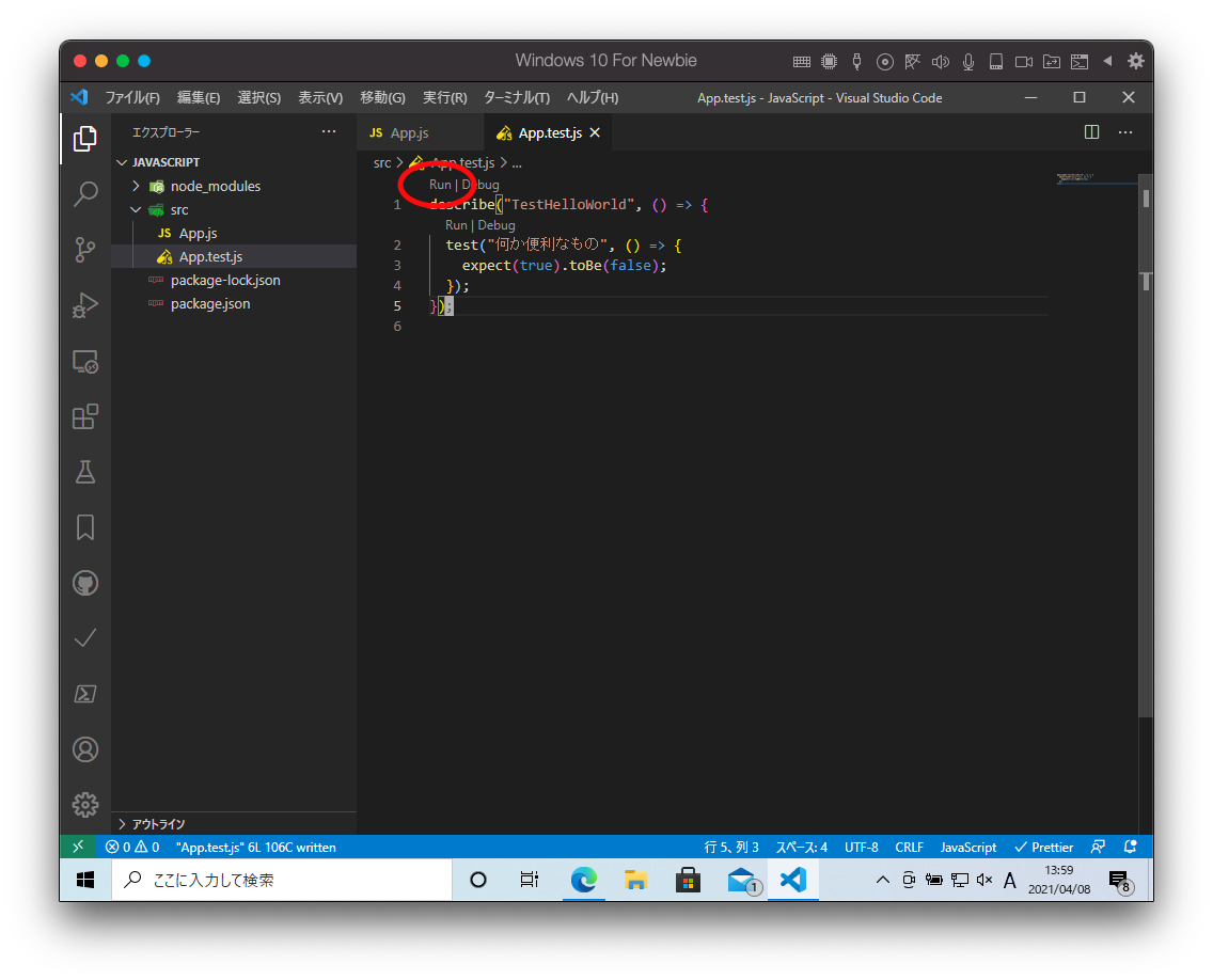 Jest Runner 拡張機能がインストールされていればコードの上に Run と表示されるのでそれを押します。