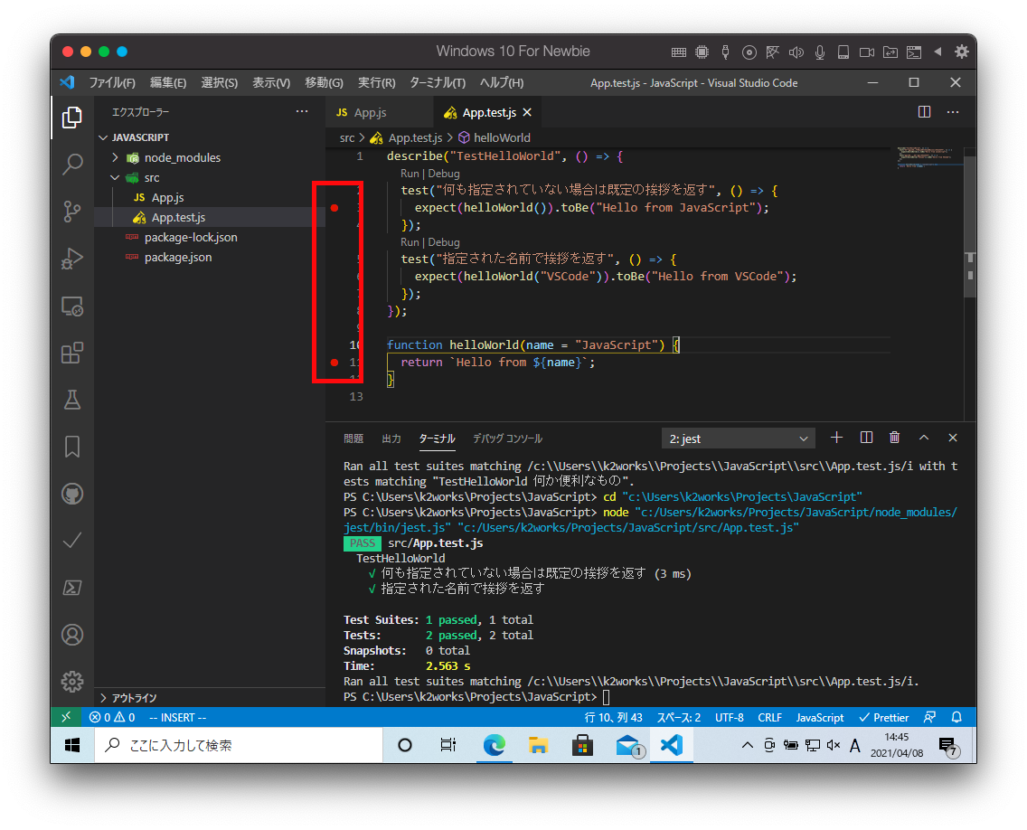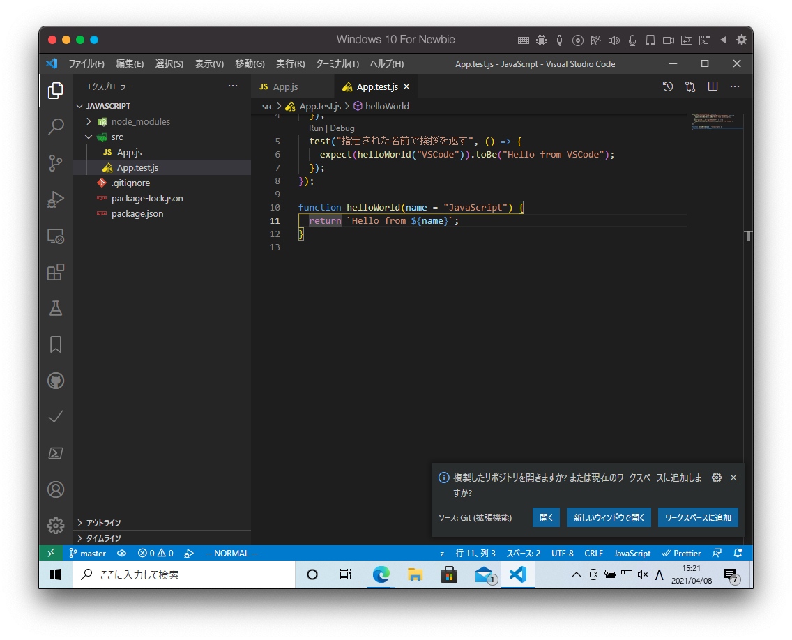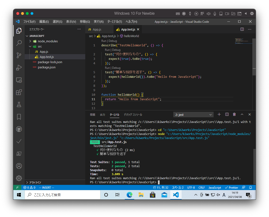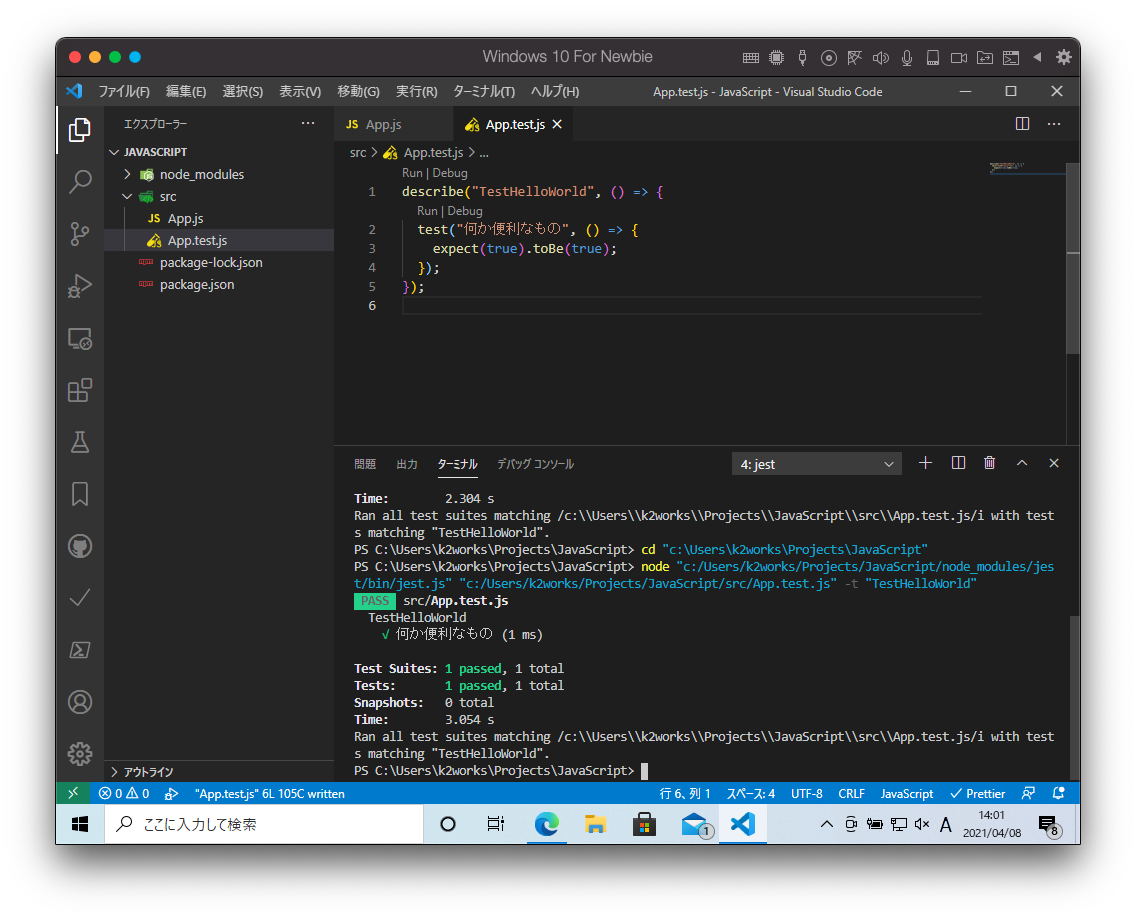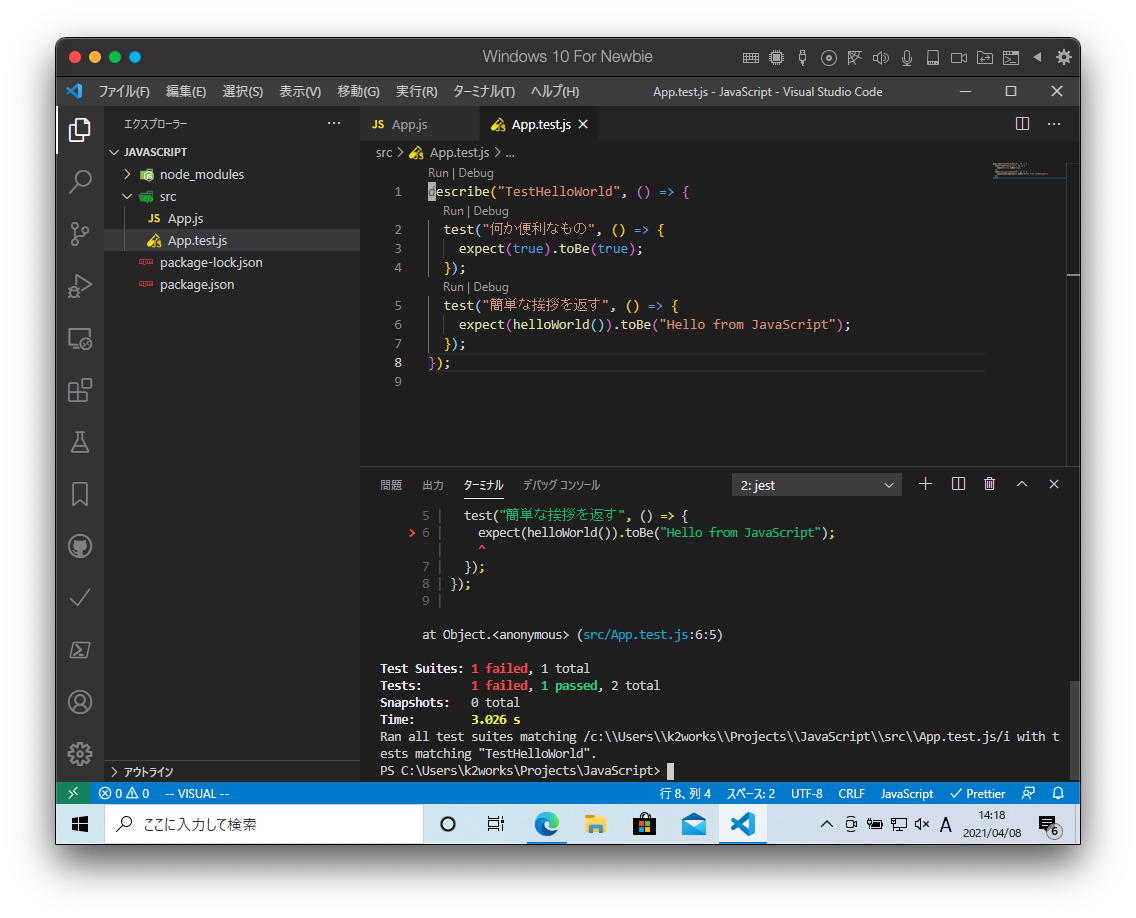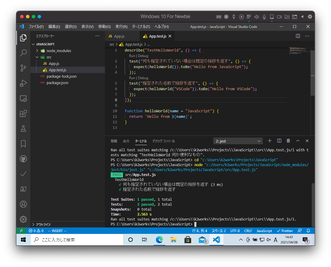 Jest Runner 拡張機能がインストールされていればコードの上に Run と表示されるのでそれを押します。
