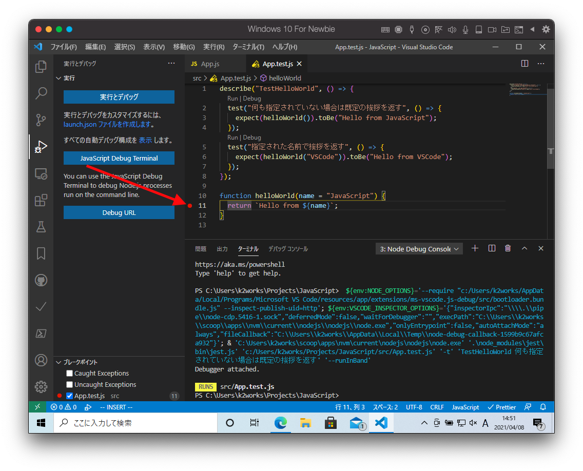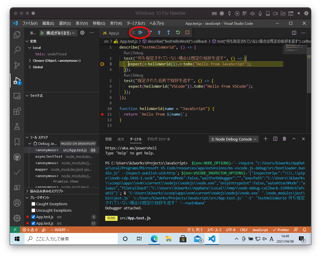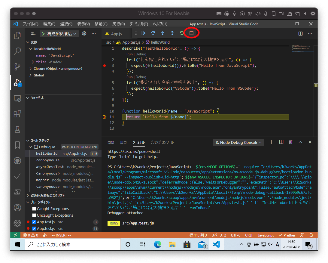 ブレークポイントを設定したら Debug を押してプログラムの実行します。そうするとブレークポイント部分でプログラムが停止して変数などの情報が確認できるようになります。