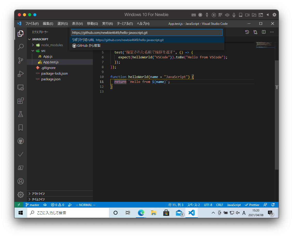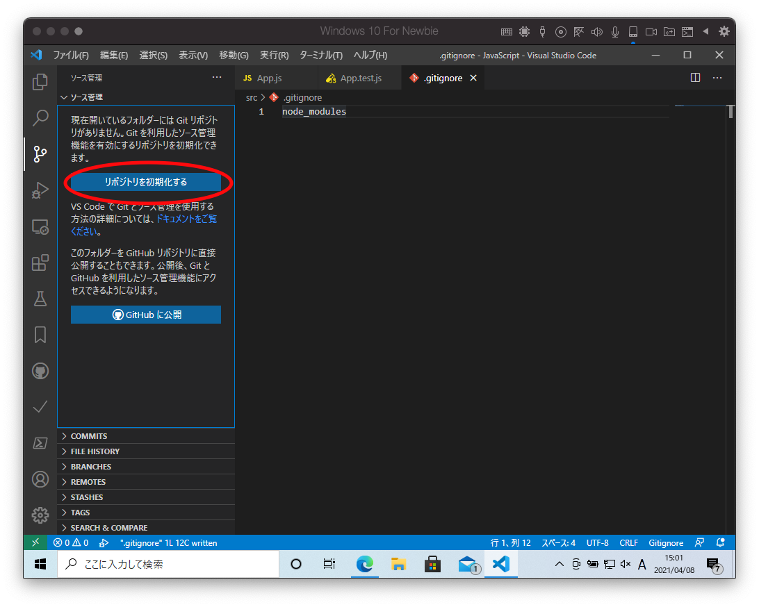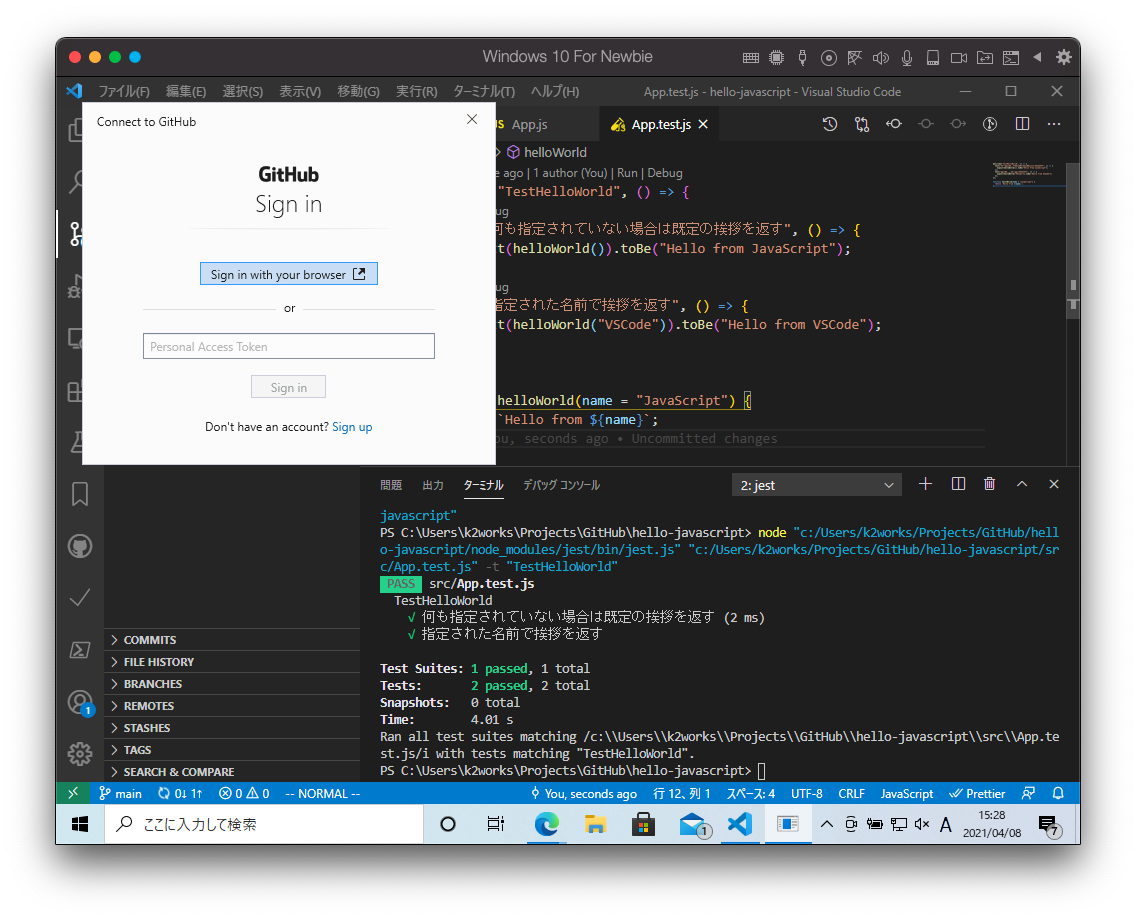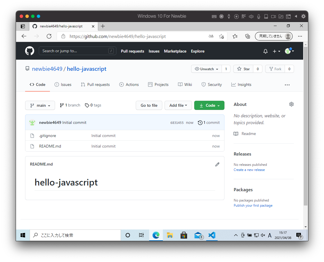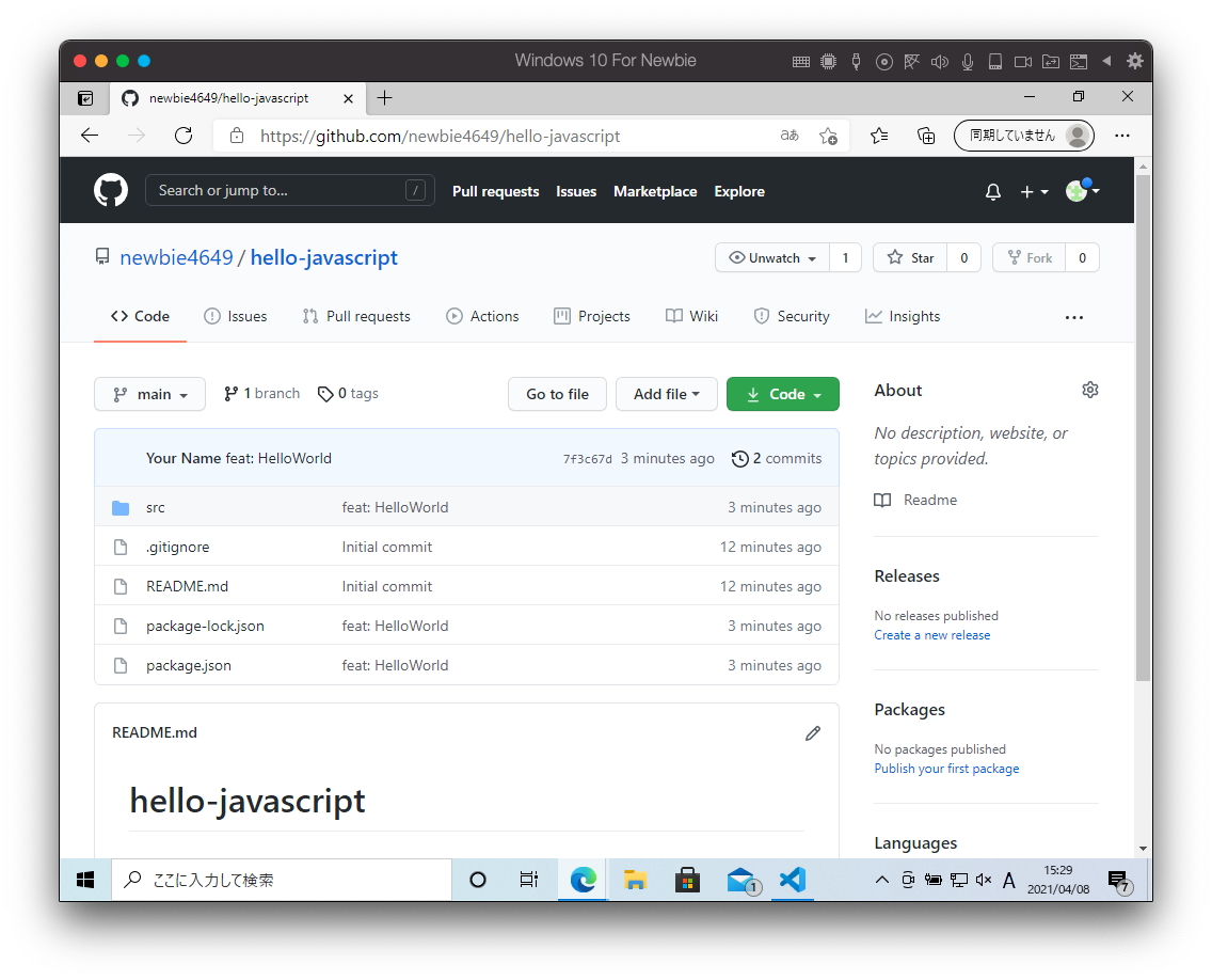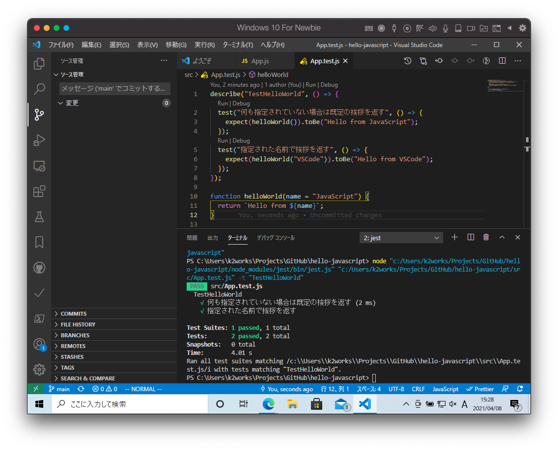 準備ができましたので先ほどやった HelloWorld プログラムをもう一度作成して先ほどと同様にローカルレポジトリに保存します。
