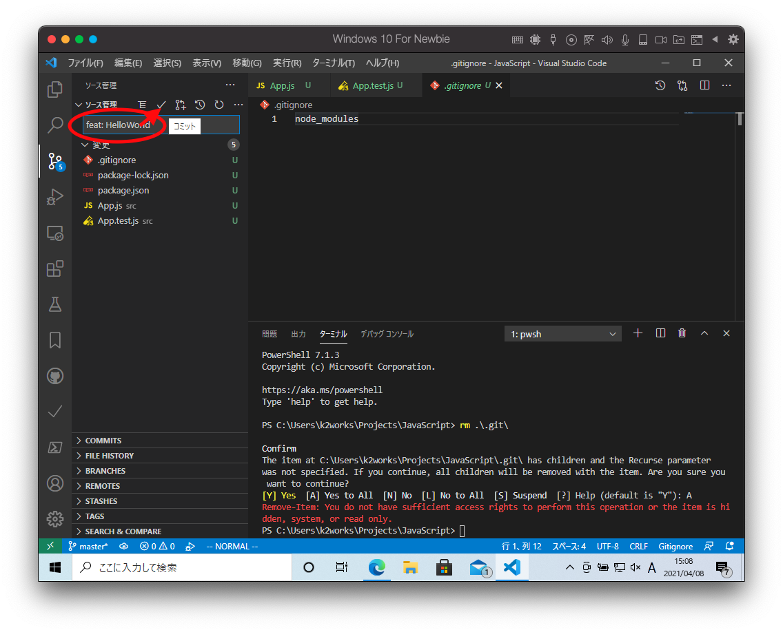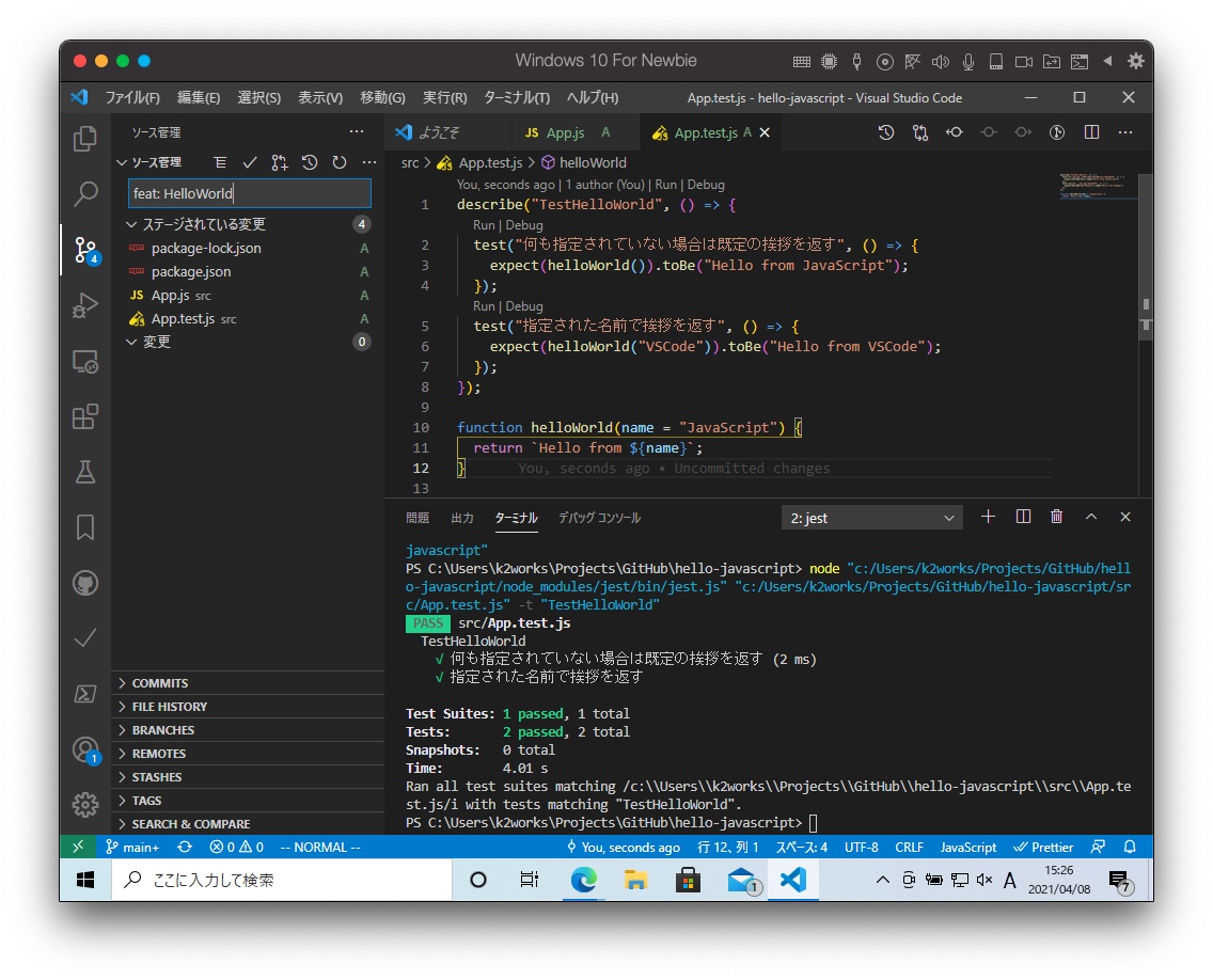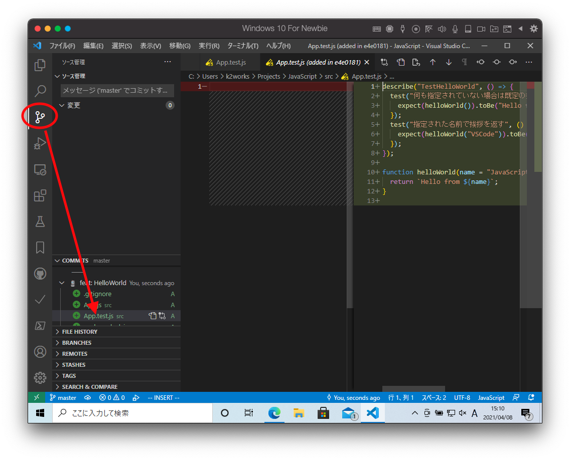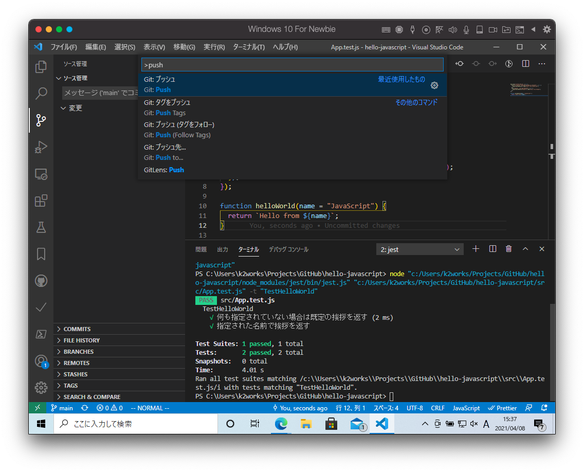 変更内容に feat: HelloWorld と入力して コミット を押します。