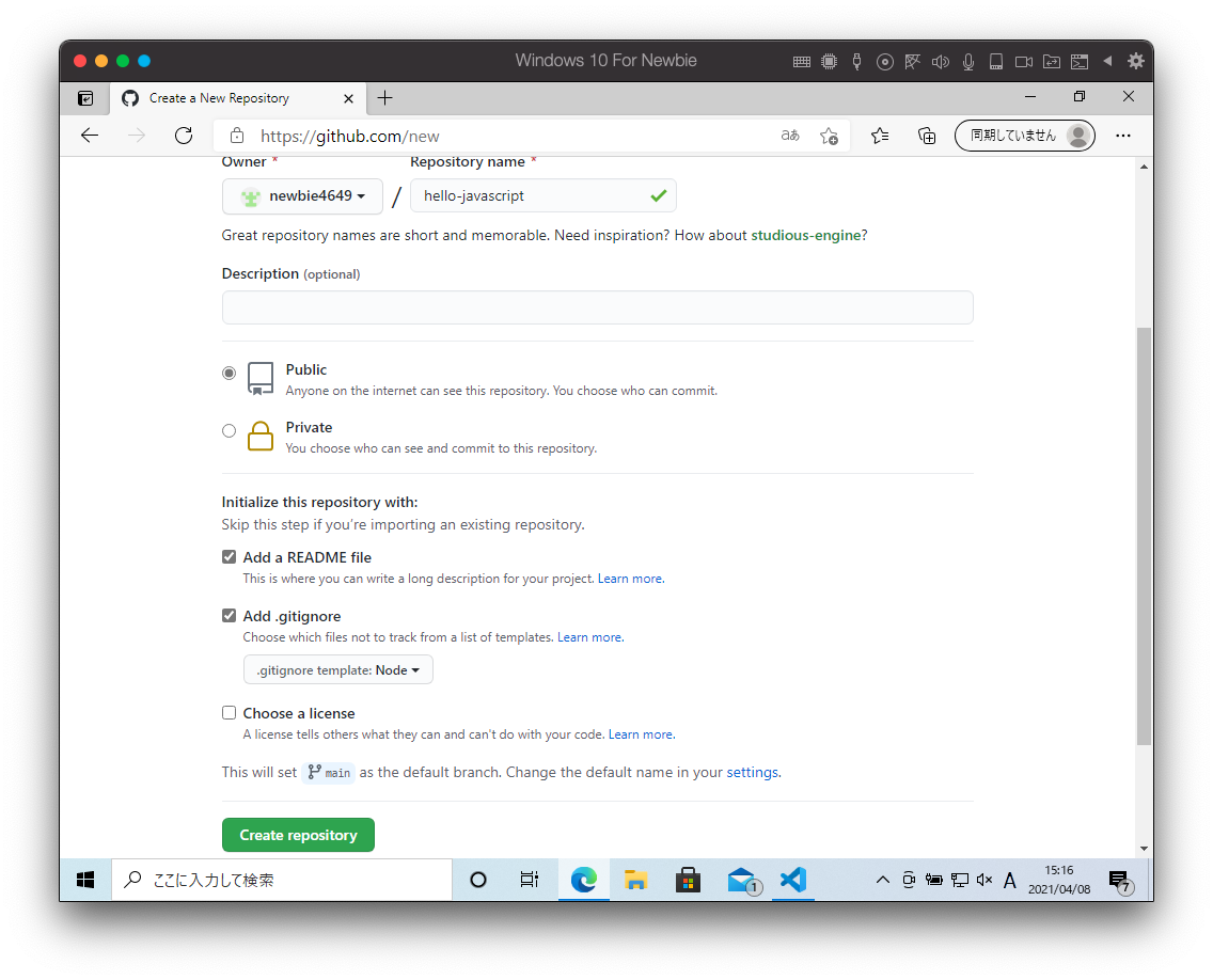 レポジトリ名は hello-javascript として Public で公開します。 公開したくない場合は Private を選択します。