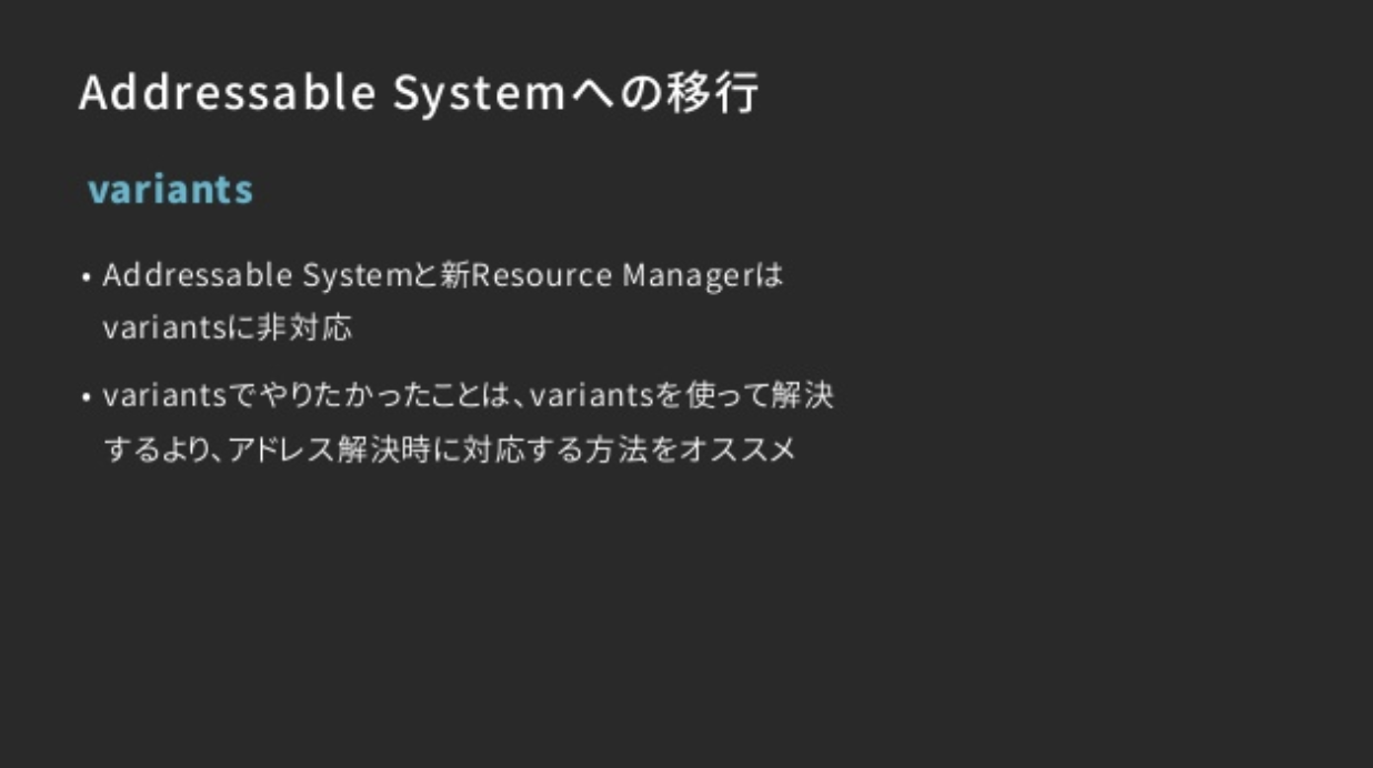 じゃあAAS使う場合はVariantsはどうすれば良いの?という話は、恐らく複数種類のprefabを作って、prefabに対応するアドレスの末尾にHDとかSDとか付けて、アドレス解決時によしなにしろ、という事だと思われる。