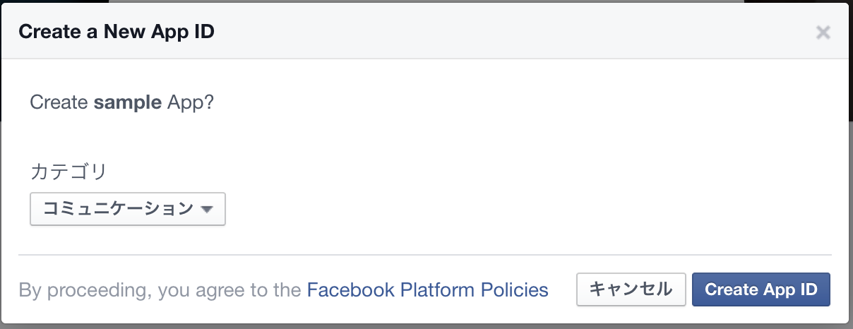 ここでは、”sample"と入力して、「Create New Facebook App ID」とクリックします。