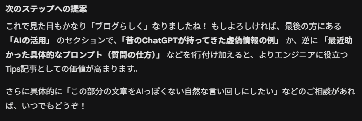 ただ、便利になった一方で頼りにしすぎると考える力がなくなる思考停止状態になりうるので、「あくまで補助ツール」としてほどほどに使っています。
