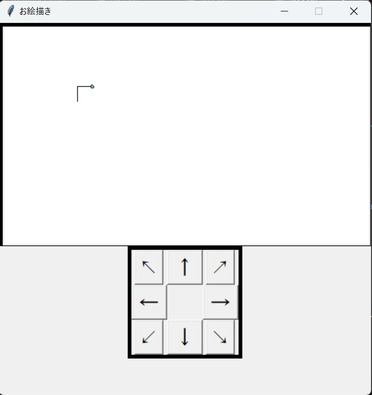 水色の点をペン先としています。ボタンを押すと、ボタンに書かれている方向に水色の点が動き、動いた跡が線で表示されます。