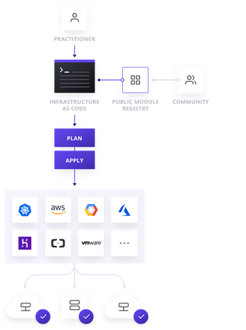 クラウドユーザであれば、聞き馴染みのツールであると思いますが、マルチクラウド環境でのIaC デファクトスタンダードはTerrafromです。Terraformを用いることで、IaCツールを統合化することができます。AWS CloudFormation、Azure Resource Managerに相当するツールが一つになり、統合的なワークフローにより、マルチクラウドインフラ環境をIaC化することが一つのツールで実現することができます。