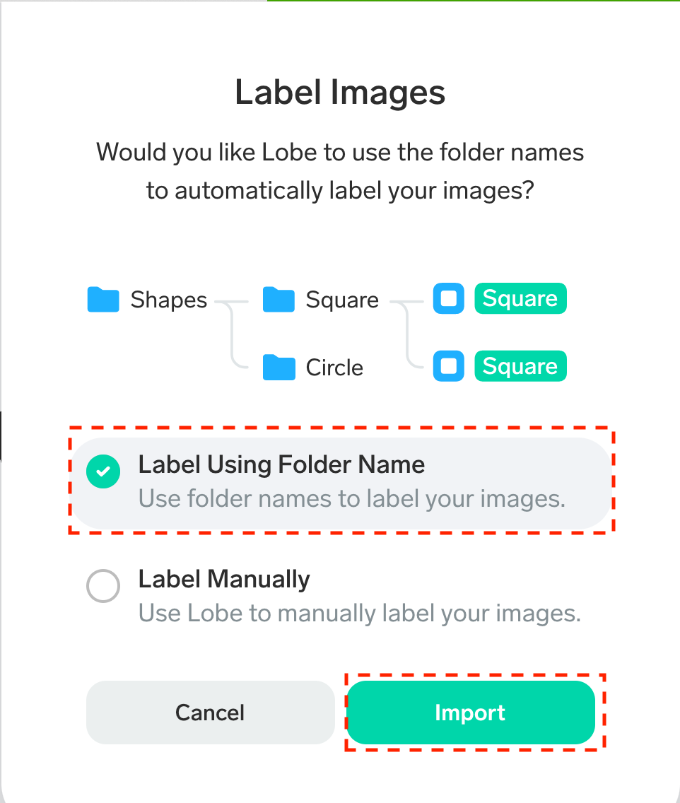 "Label Using Folder Name"のラジオボタンを選択した状態で「Import」をクリック