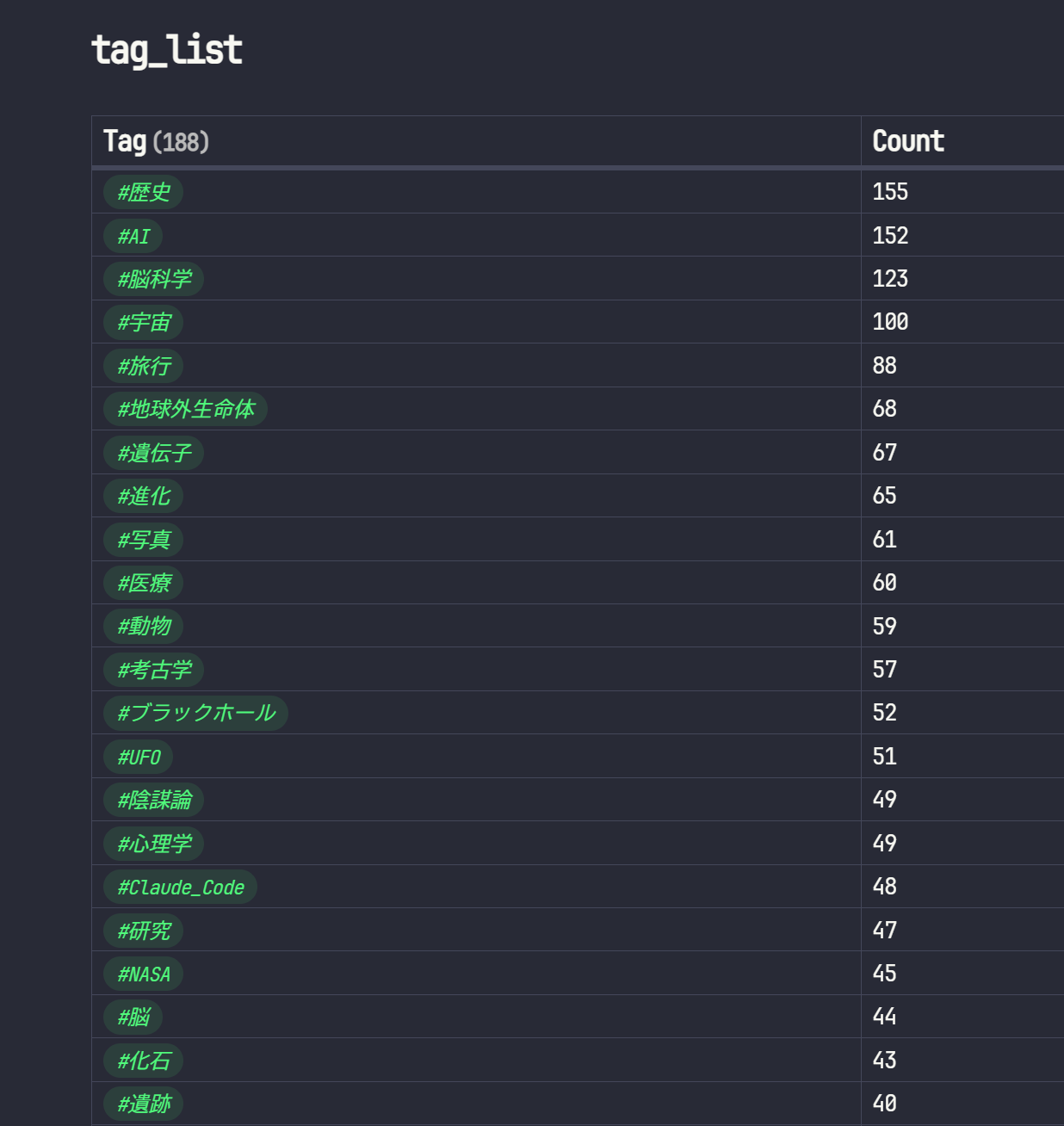 dv.table(["Tag", "Count"], filteredTags);