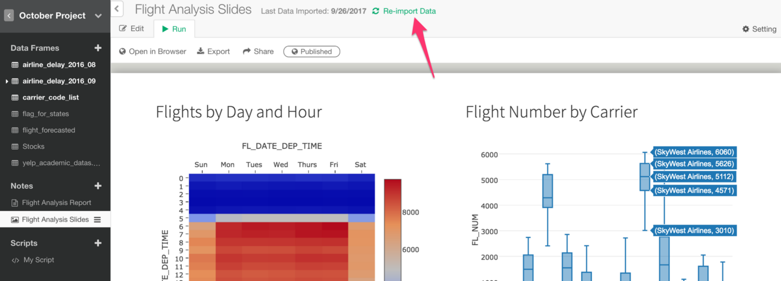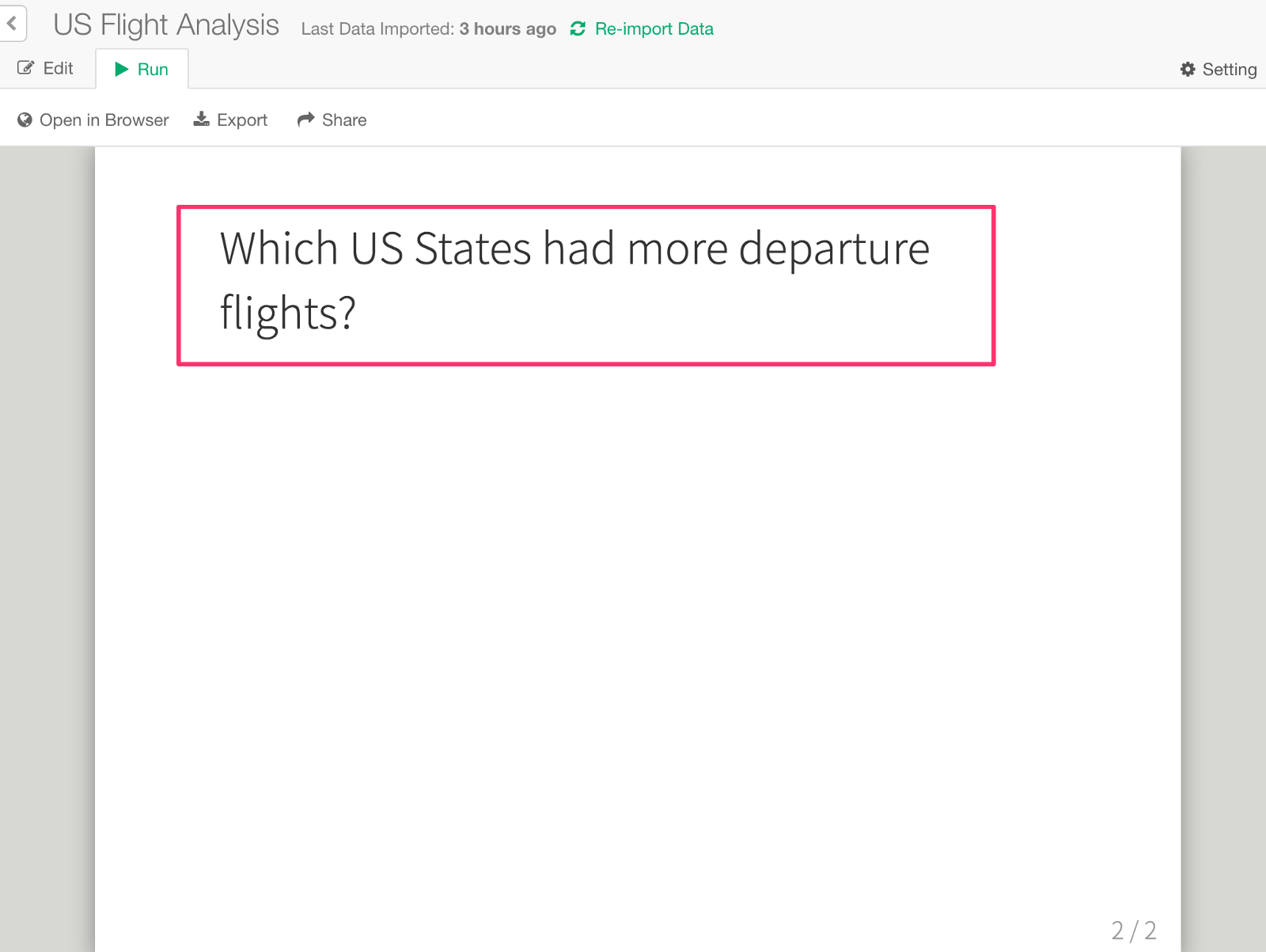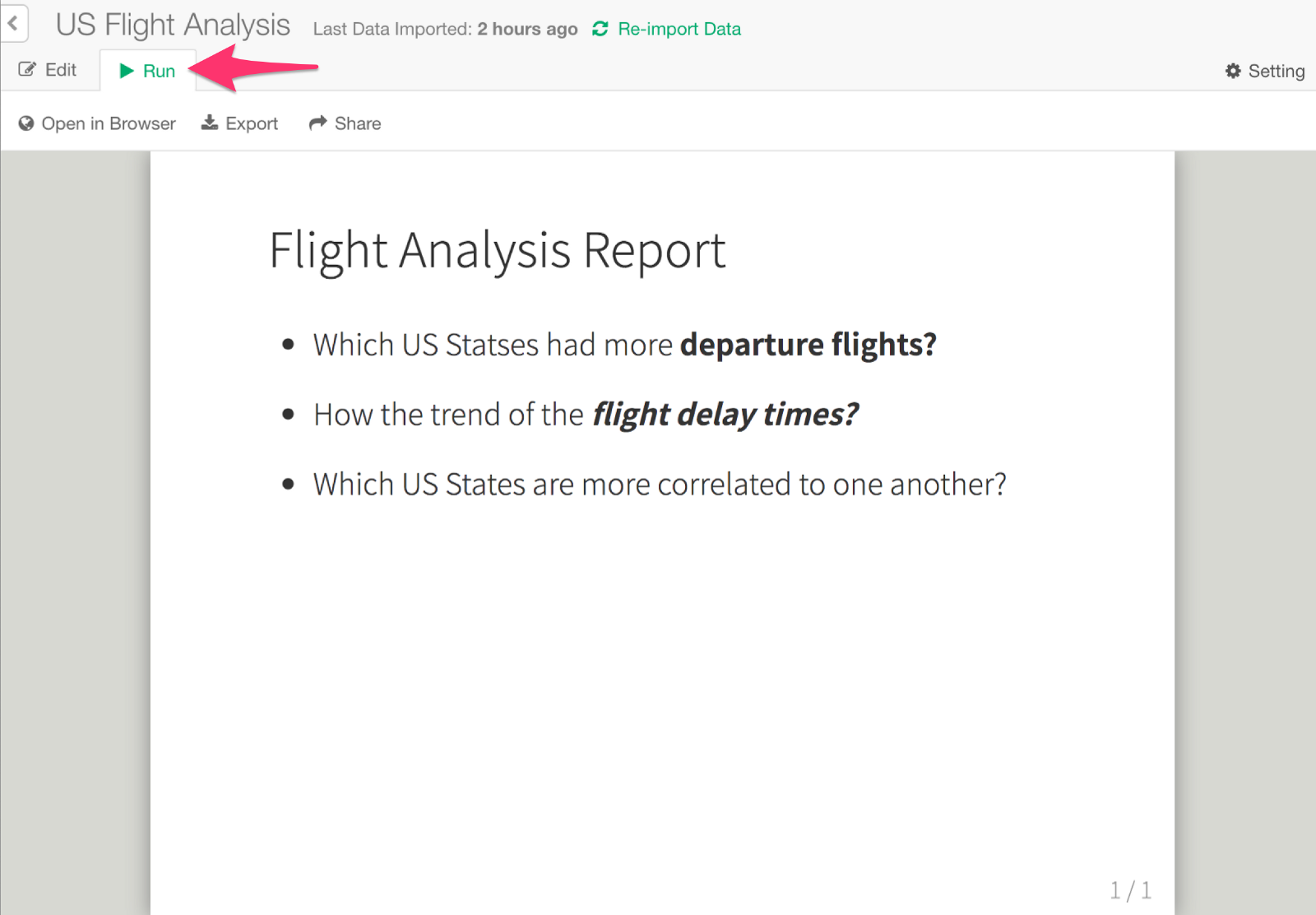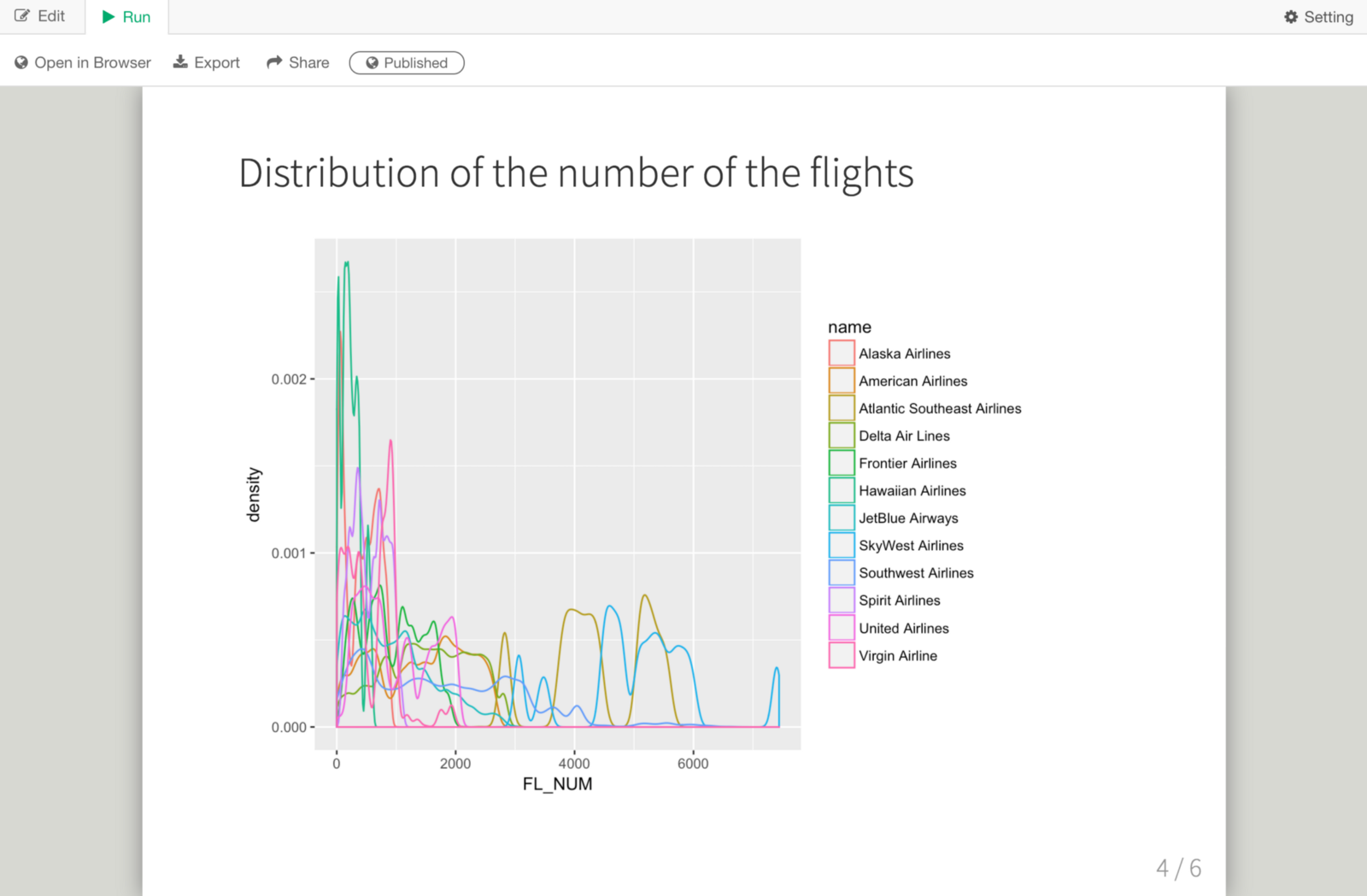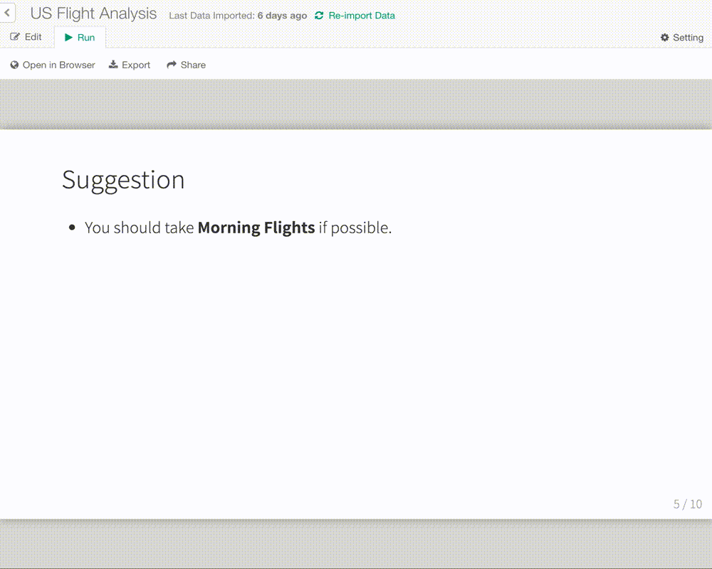 これにより、スライドで使用されているすべてのチャートと分析で使われているデータがデータソースから再インポートされ、最新の状態に更新されます。「Re-Import Data」が完了したら、「Run」ボタンをクリックすることで、最新のデータを元にスライドの出力行うことができます。この、スライドの再現性こそが、Exploratoryでスライドを作ることをお勧めする一番の理由です。