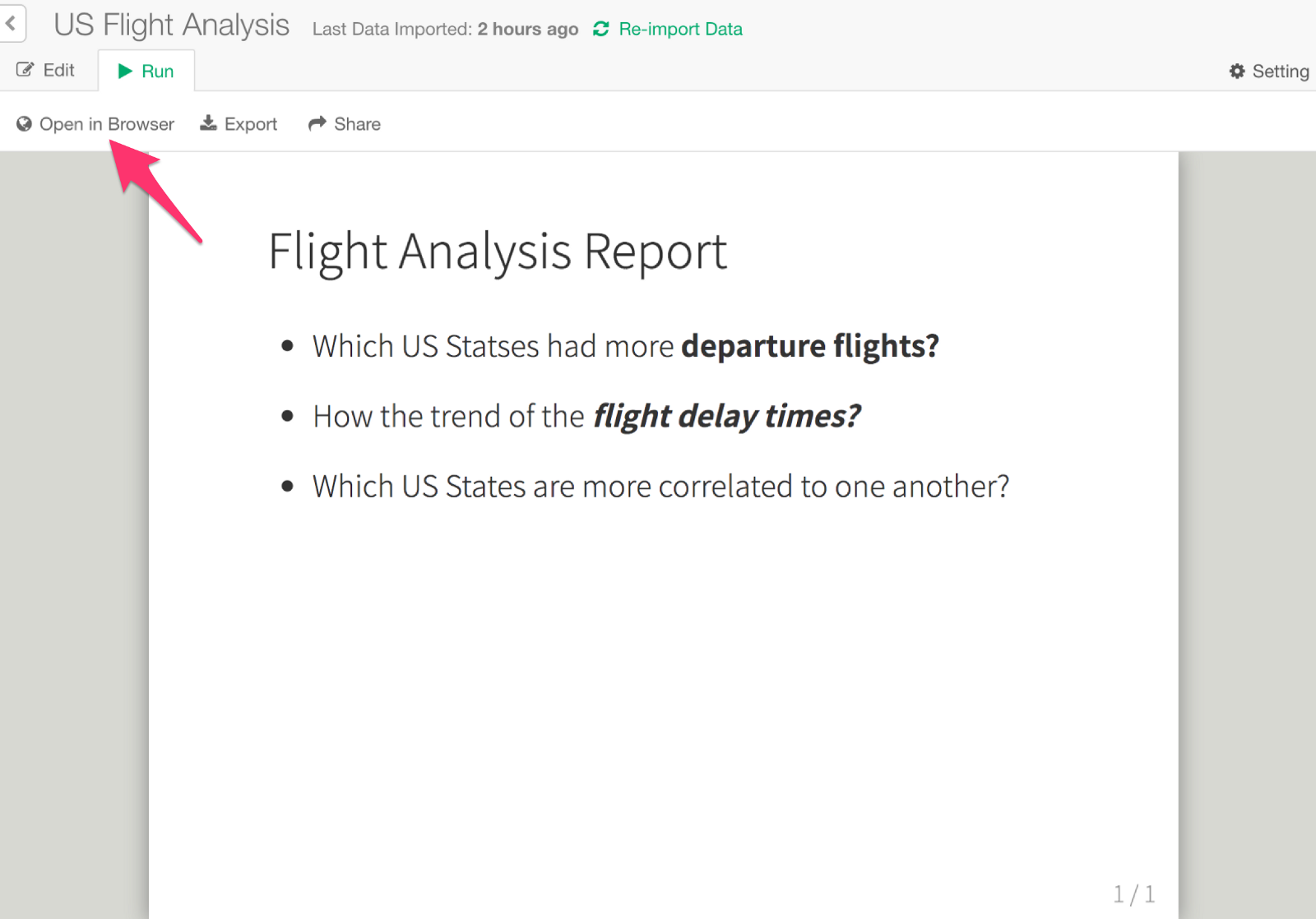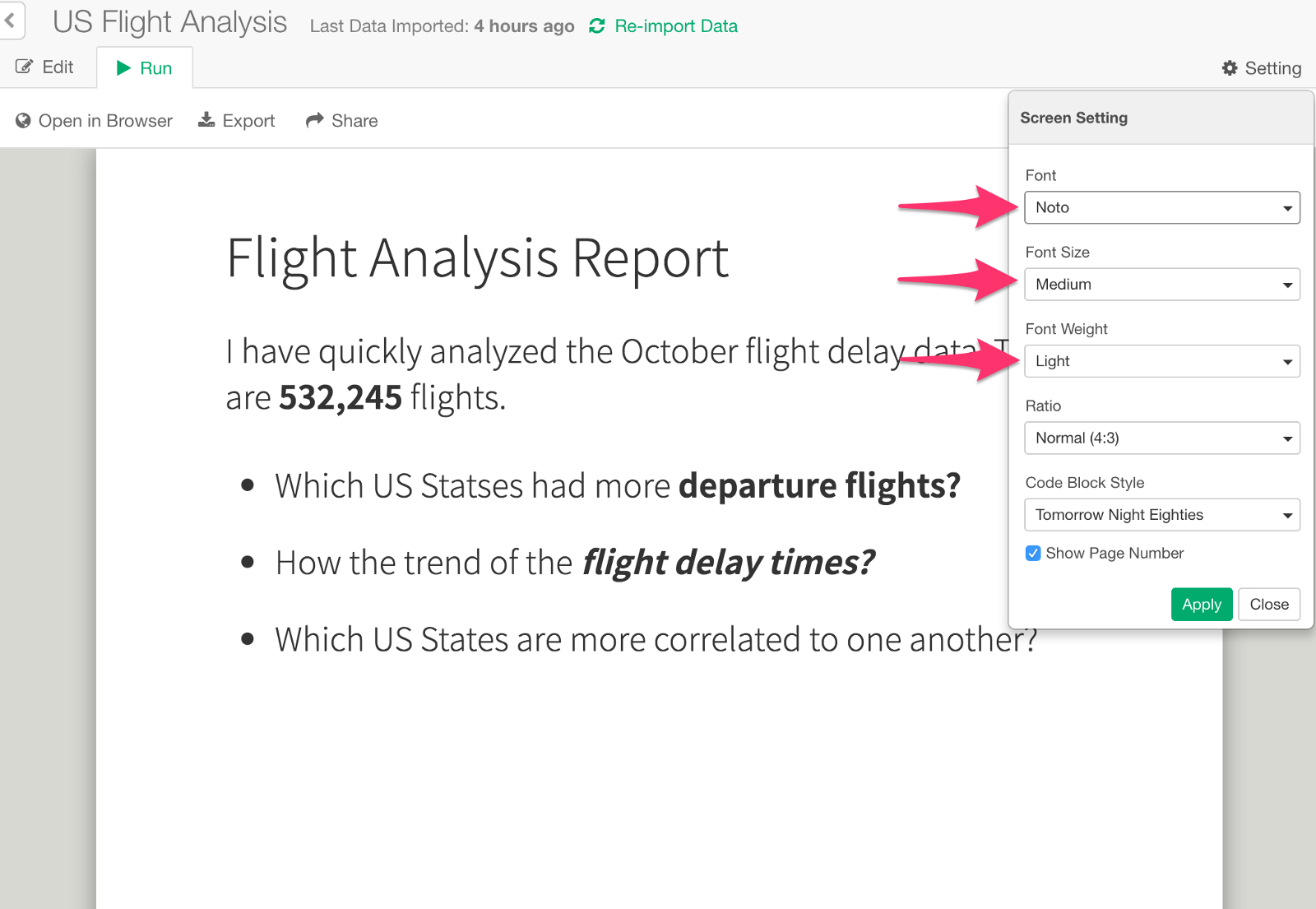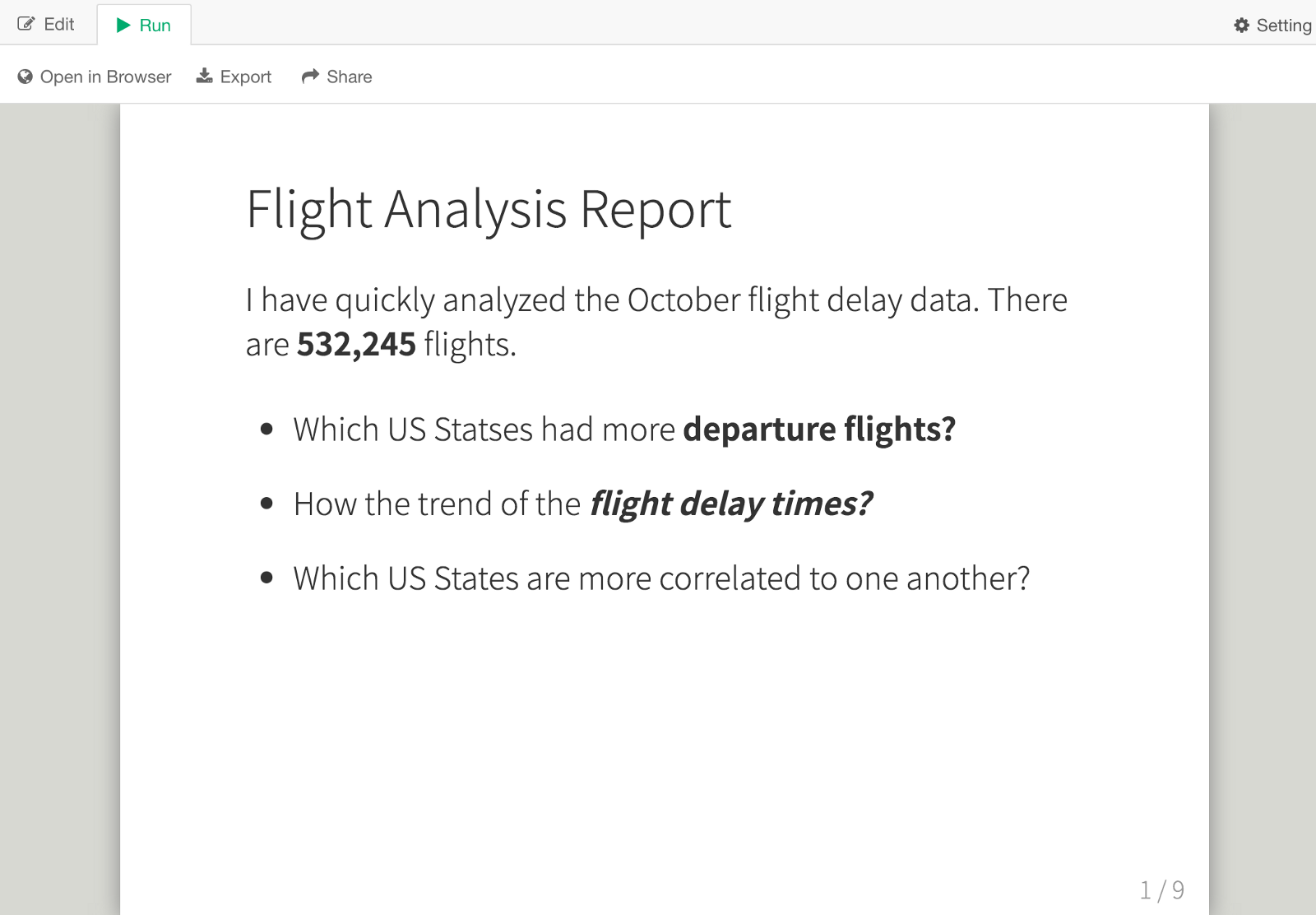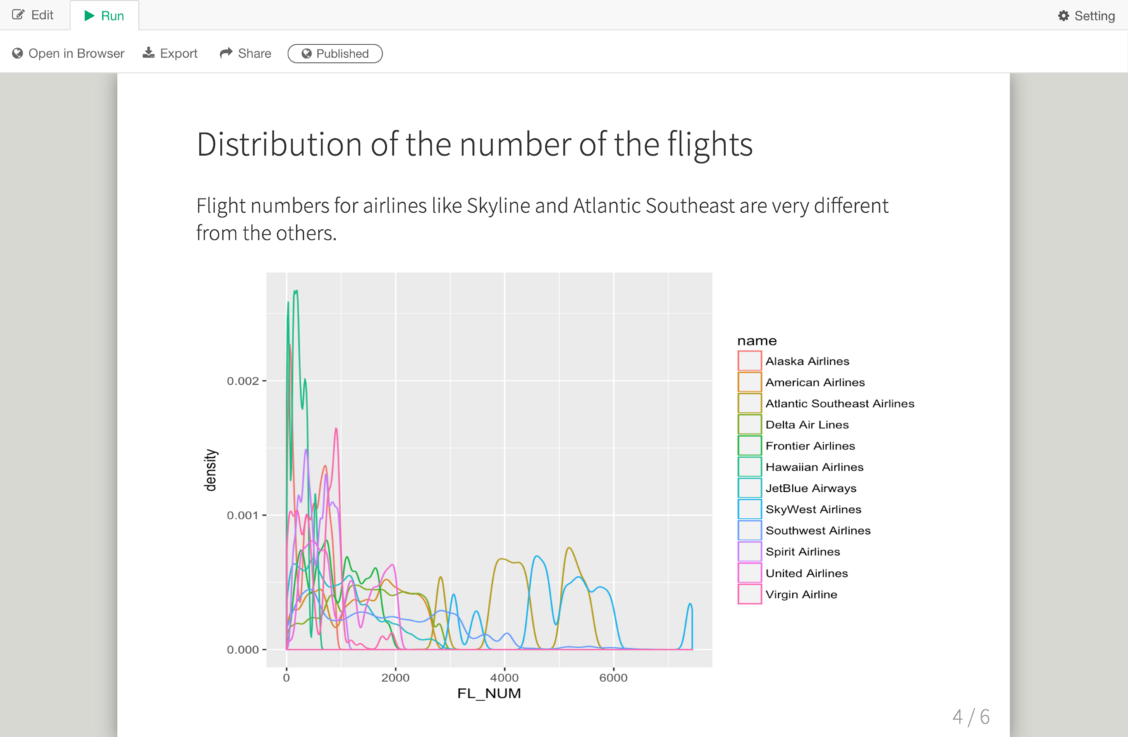 これにより、スライドで使用されているすべてのチャートと分析で使われているデータがデータソースから再インポートされ、最新の状態に更新されます。「Re-Import Data」が完了したら、「Run」ボタンをクリックすることで、最新のデータを元にスライドの出力行うことができます。この、スライドの再現性こそが、Exploratoryでスライドを作ることをお勧めする一番の理由です。