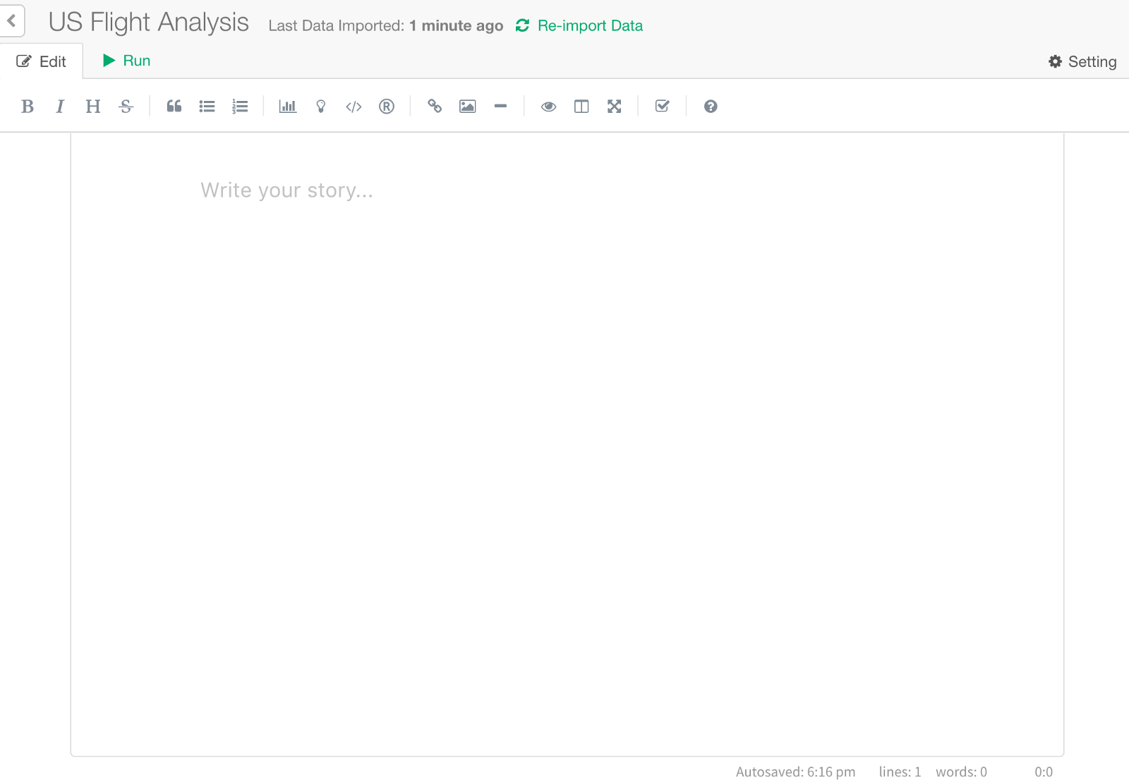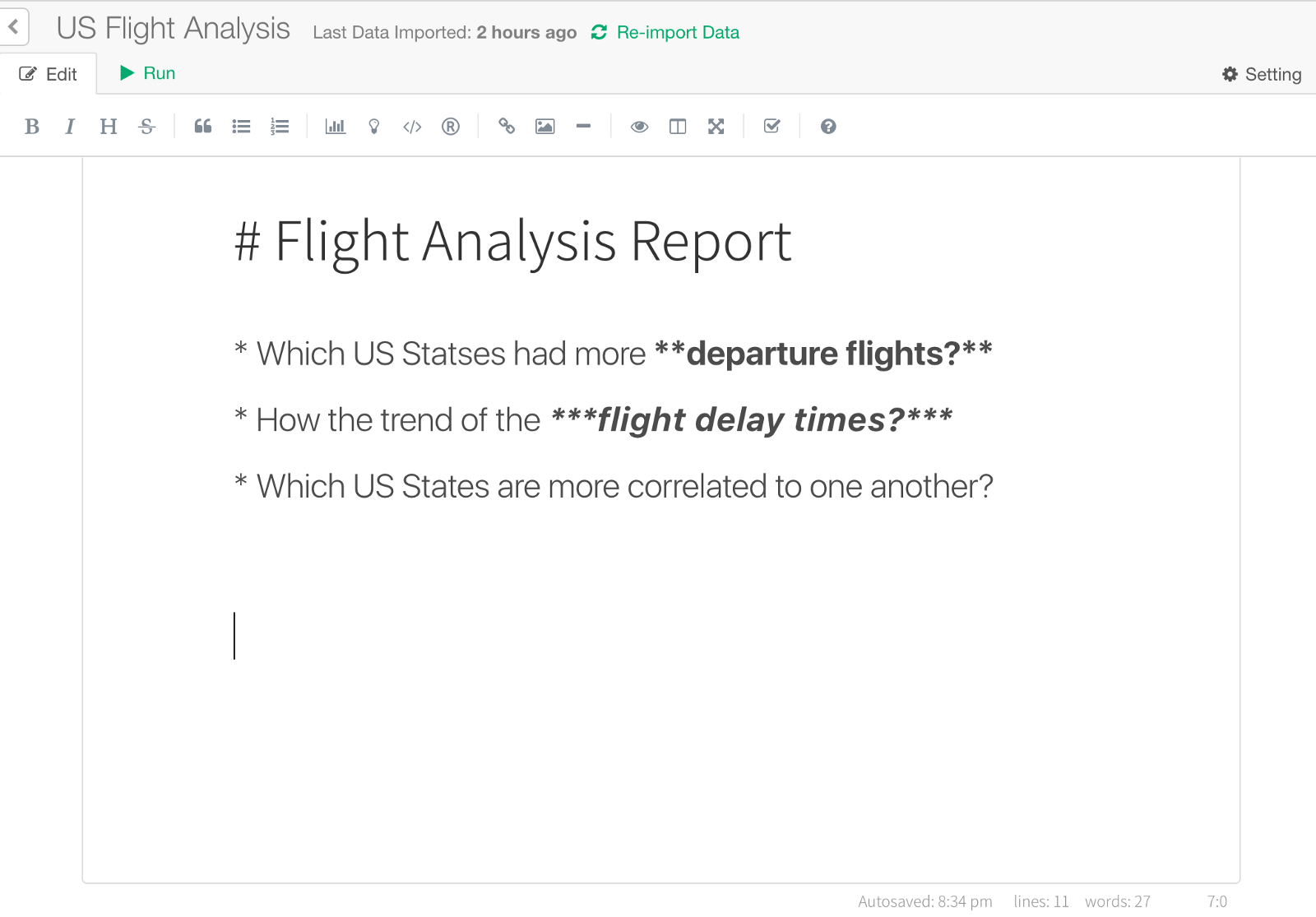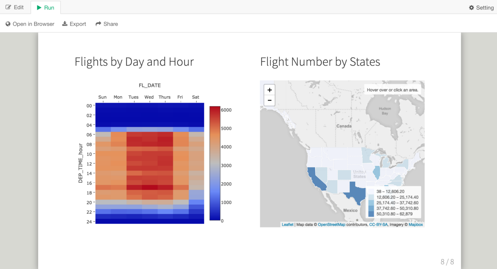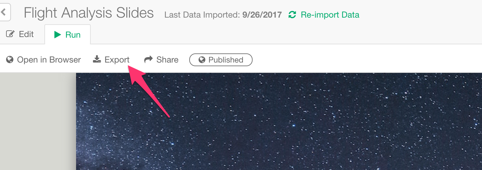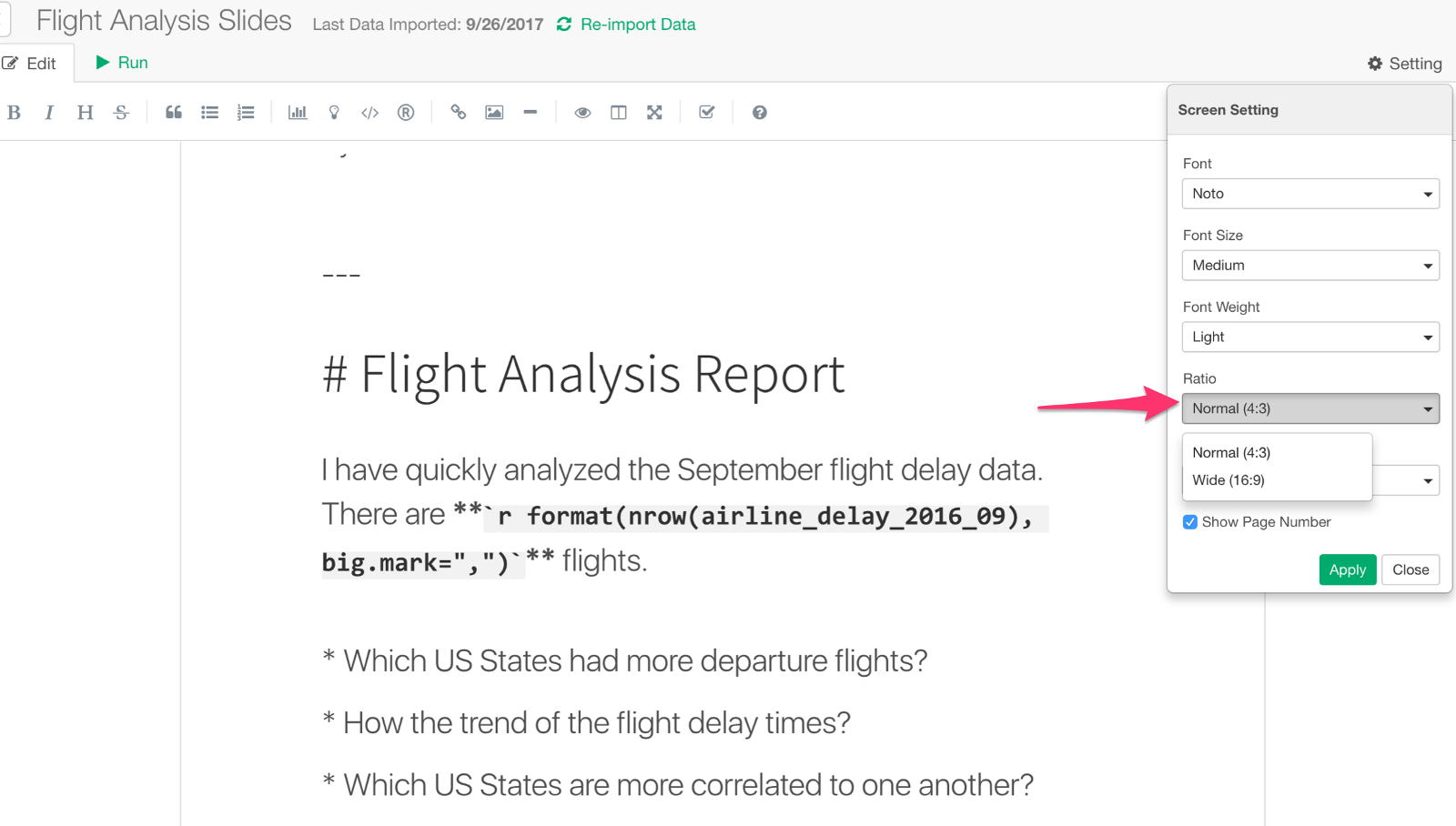 これにより、スライドで使用されているすべてのチャートと分析で使われているデータがデータソースから再インポートされ、最新の状態に更新されます。「Re-Import Data」が完了したら、「Run」ボタンをクリックすることで、最新のデータを元にスライドの出力行うことができます。この、スライドの再現性こそが、Exploratoryでスライドを作ることをお勧めする一番の理由です。