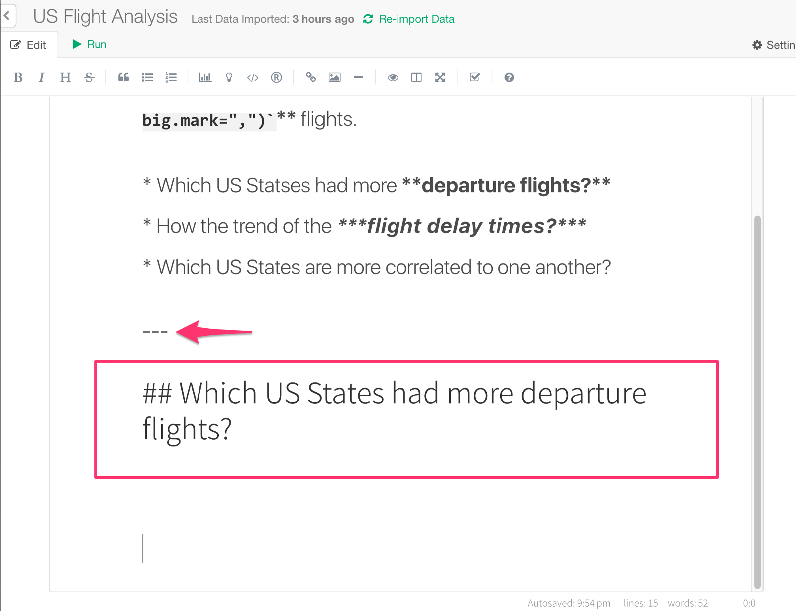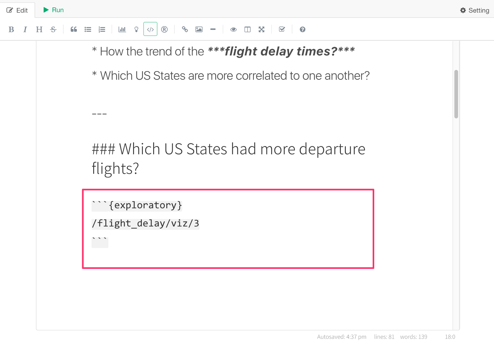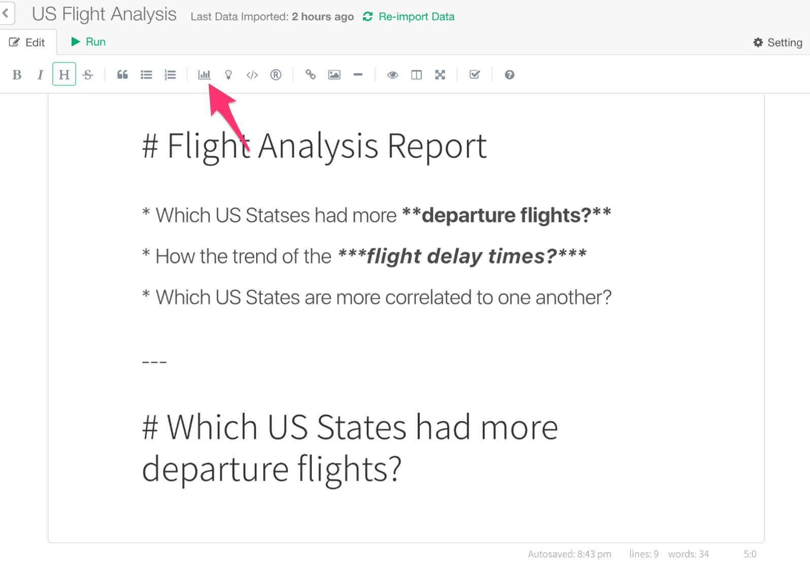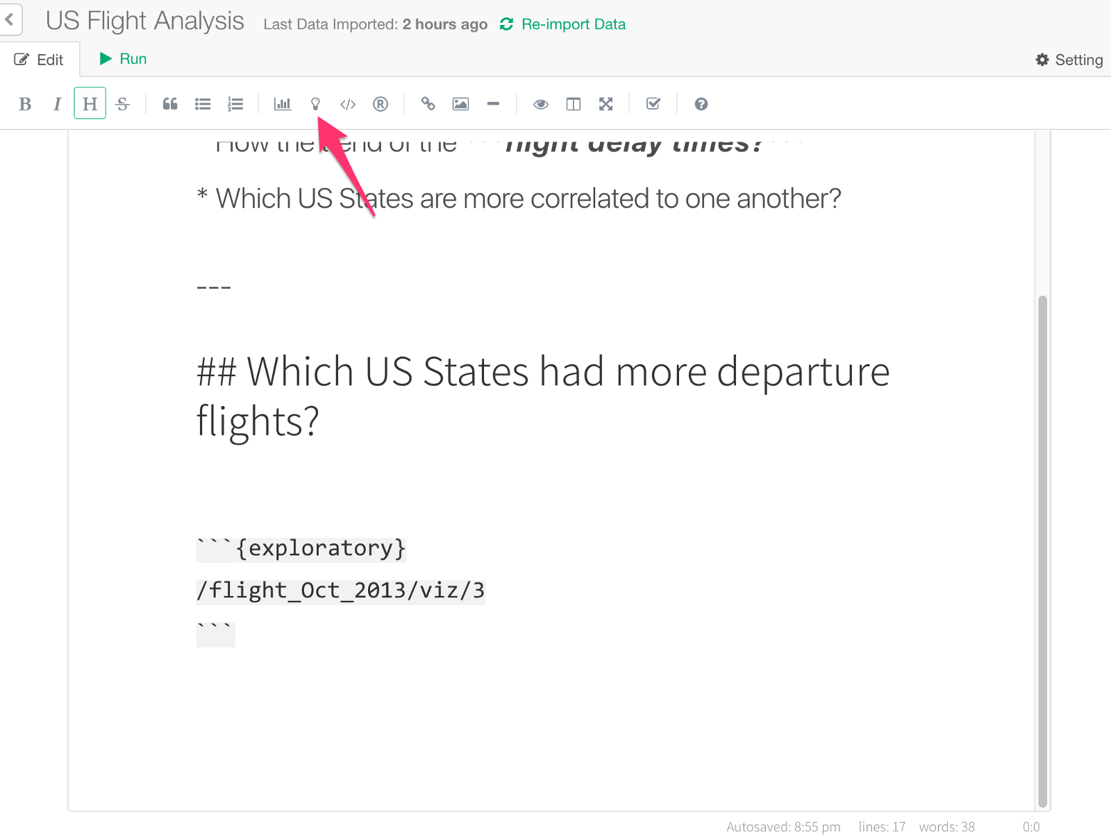 これにより、スライドで使用されているすべてのチャートと分析で使われているデータがデータソースから再インポートされ、最新の状態に更新されます。「Re-Import Data」が完了したら、「Run」ボタンをクリックすることで、最新のデータを元にスライドの出力行うことができます。この、スライドの再現性こそが、Exploratoryでスライドを作ることをお勧めする一番の理由です。