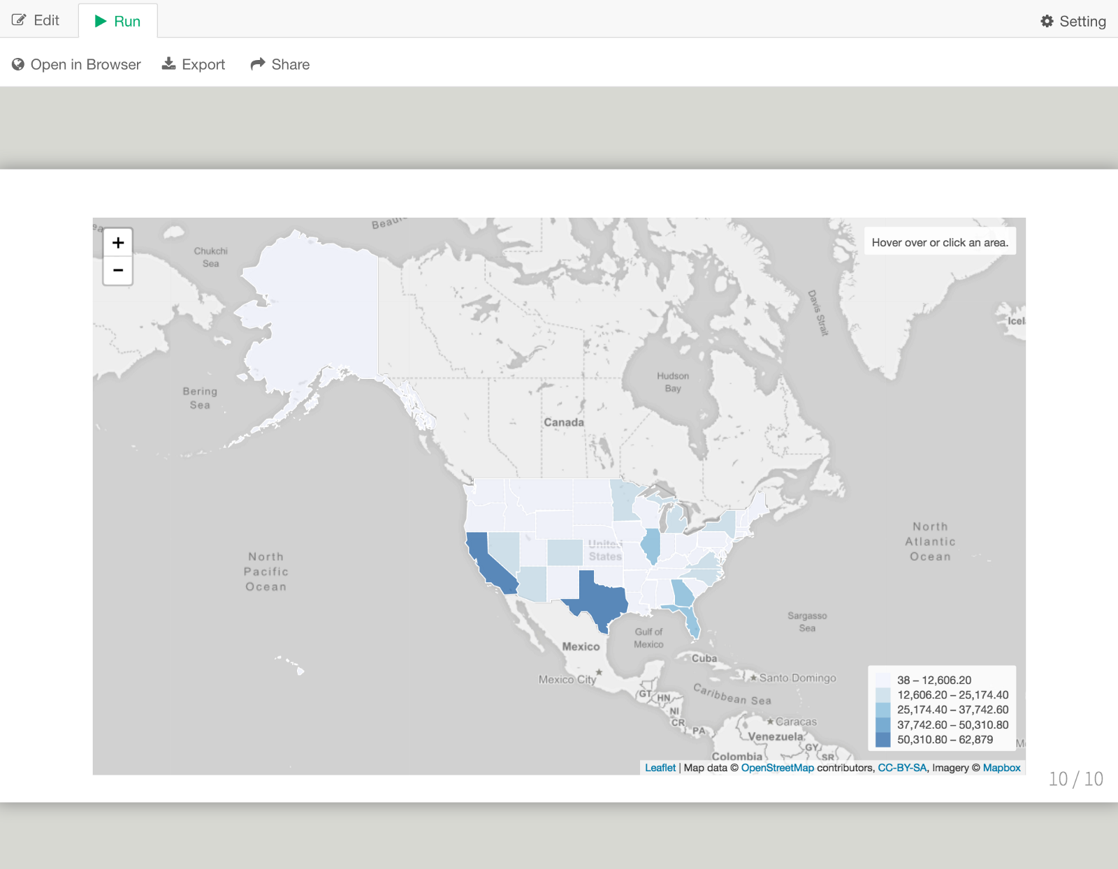 一度作ったスライドをずっと更新することなく使い続けることができるというのは極めて稀で、大抵の場合は、スライドで使用されているデータの加工手順を変更したり、スライドに表示されているチャートを調整したり、と、さまざまな理由でスライドを更新する必要が出てきます。プレゼンテーションスライドは、「Run」ボタンをクリックして、スライドを再実行するだけで、スライドの中で使われているデータの加工手順やチャートを自動的に最新の状態に更新することができます。チャート画像を再エクスポートしたり、スクリーンショットを取り直す必要はありません。
