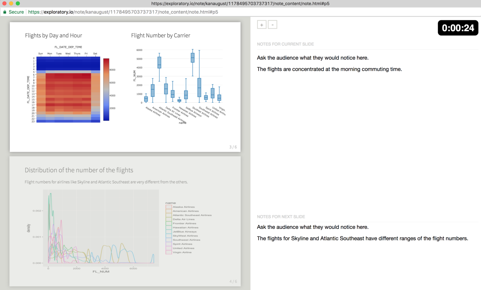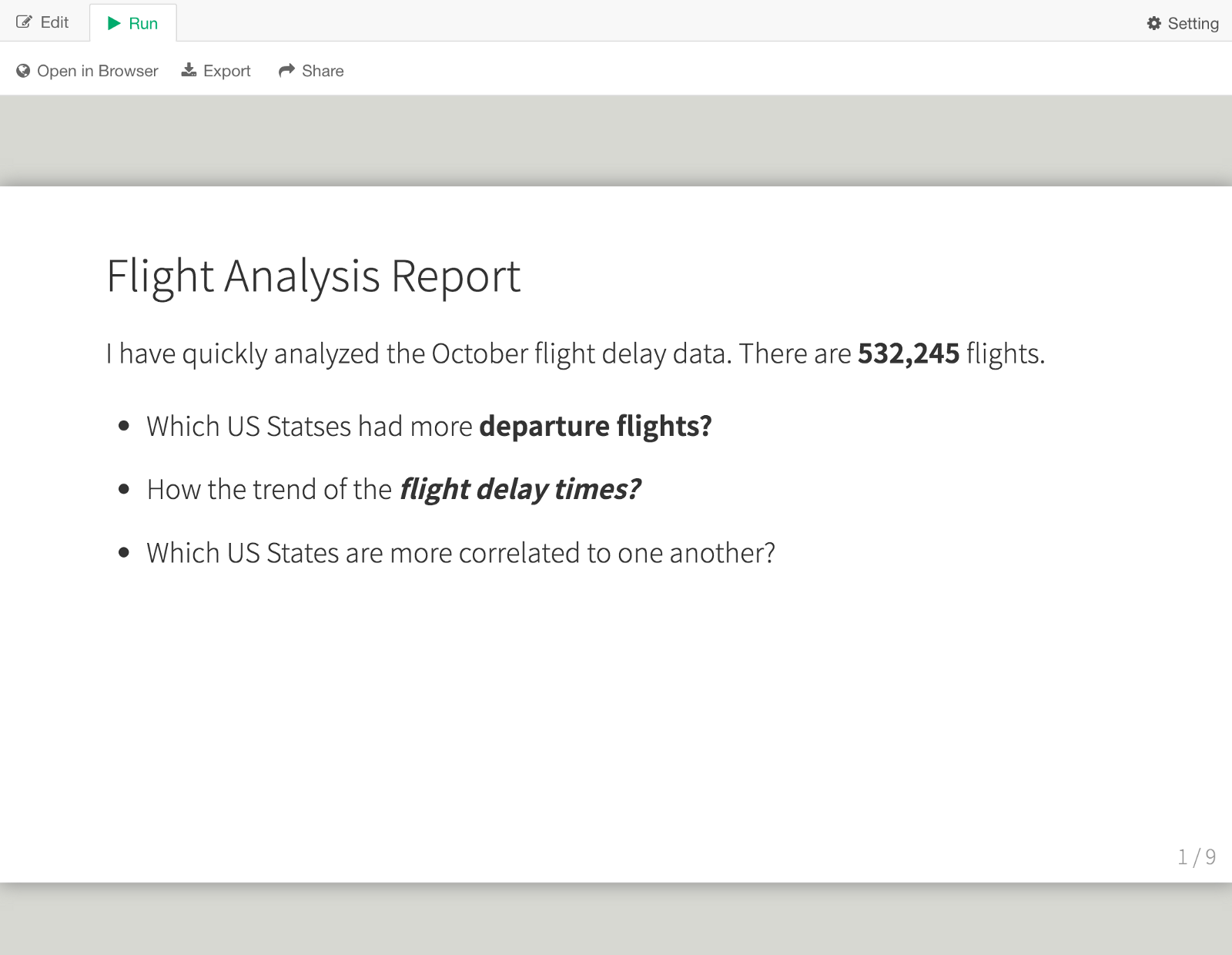 データ分析をすることによっていかに有用な発見をしたとしても、それを他の人と共有して伝えることができなくては意味がありません。Exploratoryでは、Exploratory上での発見を元にノートを作成し、それを他の人に送信することができます。しかし、ミーティングや会議などでは、多くの場合、リアルタイムにあなたの発見をストーリーとして提示する必要があります。そして、このような場面では、プレゼンテーションスライドが用いられることが一般的です。