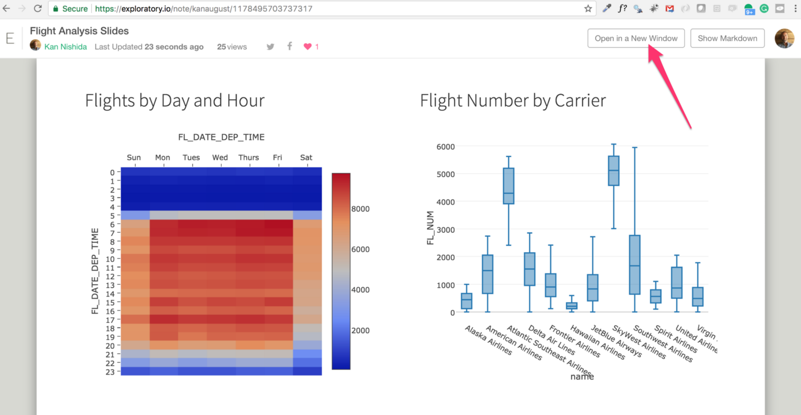 exploreor.io上にパブリッシュすると、「Open in a New Window」ボタンが右上に現れます。