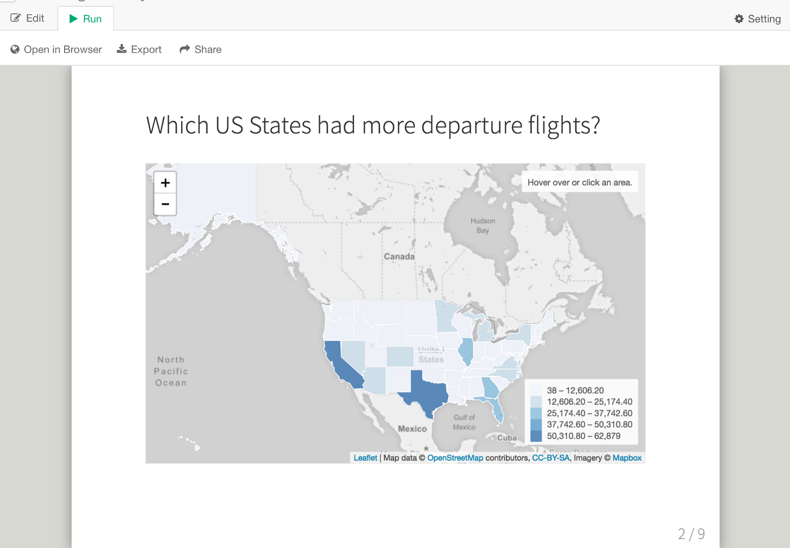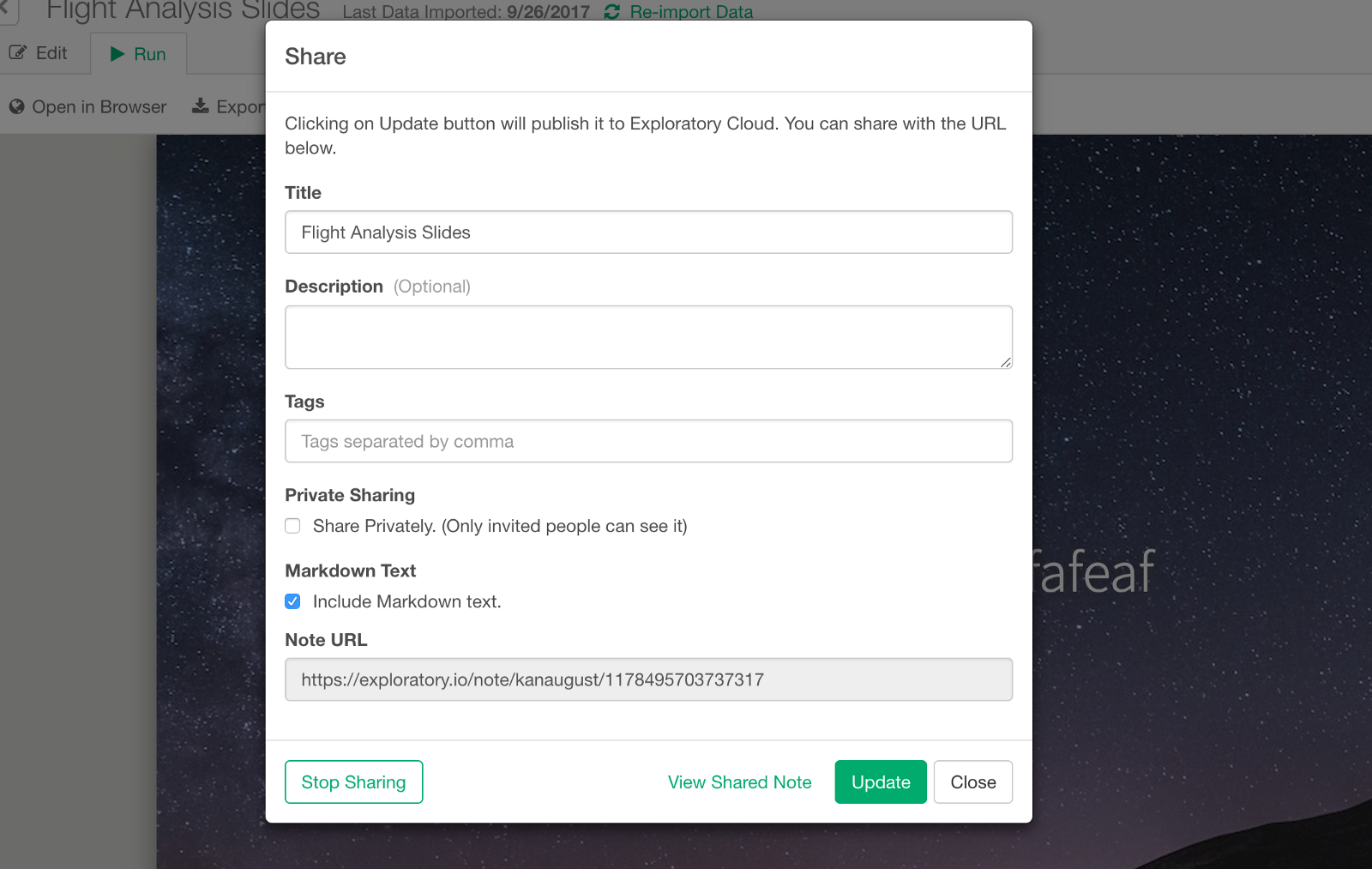 完成したスライドを実行するには2通りの方法があります。 1つはexploratory.ioにパブリッシュし、そこから実行する方法、もう1つは、ファイルシステムにエクスポートして実行する方法です。 まずは、exploratory.ioにパブリッシュして実行する方法を見てみましょう。