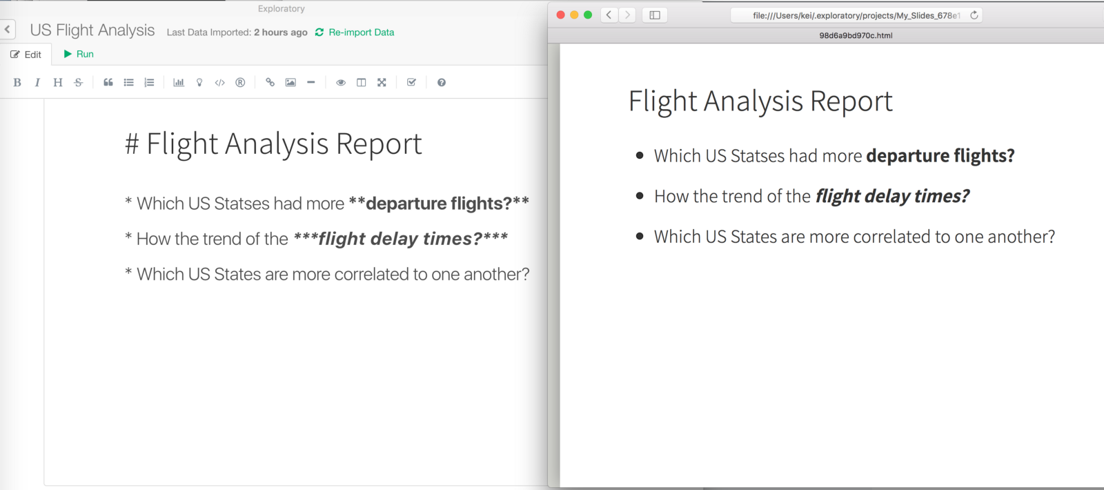 Exploratoryのプレゼンテーションスライド機能を使うことで、Exploratory上での発見を、簡単に、効果的に、そして再現性のある方法で、プレゼンテーションスライドにすることができます。また、ノートとプレゼンテーションスライドは共通のMarkdownを利用しているので、Markdownをコピーすることで、ノートをスライドに、またはスライドをノートに簡単に切り替えることできます。