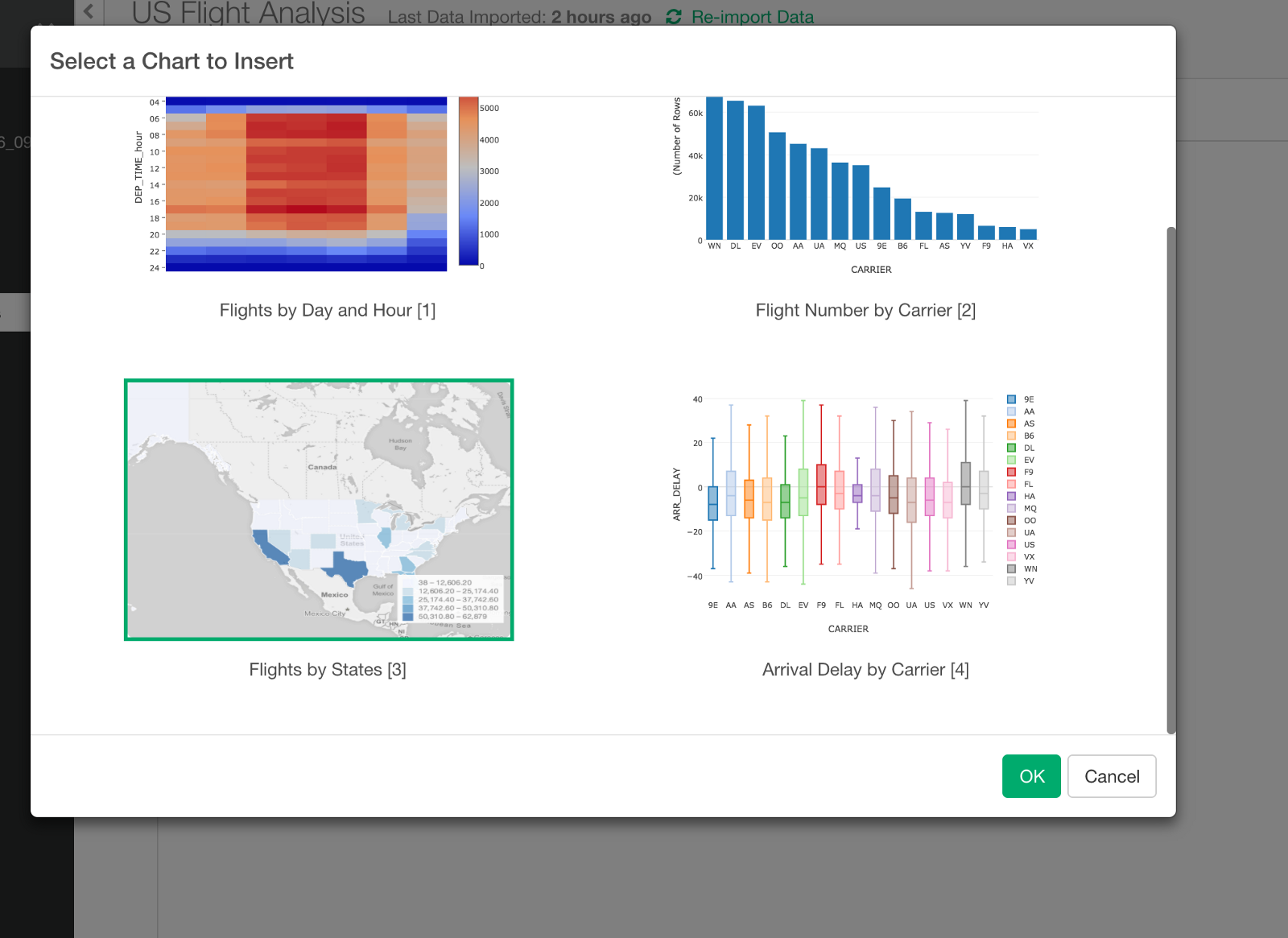 アナリティクスビューで表示されているチャートやテーブルなども、同様にプレゼンテーションスライドに追加することができます。ライトのアイコンをクリックすると、アナリティクスチャートを選択するダイアログが表示され、通常のチャートと同様の方法で追加することができます。