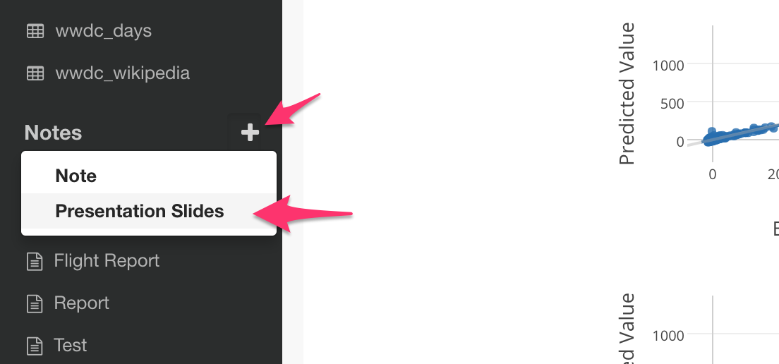 プレゼンテーションスライドを作成するには、「Notes」の横にある「+」ボタンをクリックし、メニューから「スライド」を選択します。