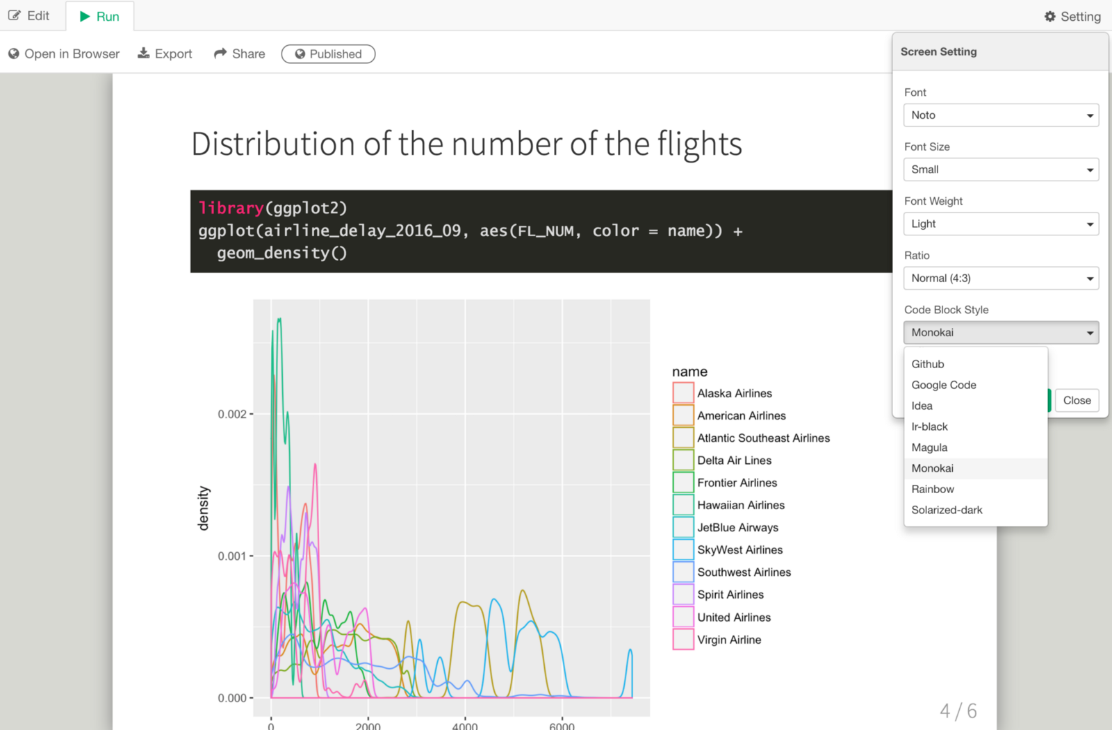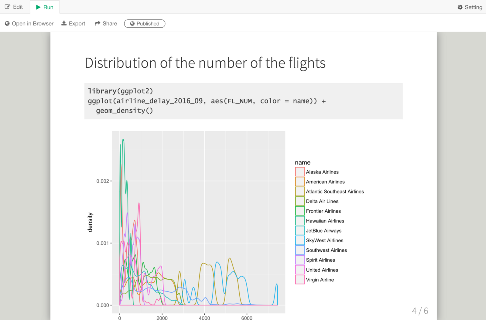 RのコードをRコードブロックに埋め込んで、その場でRコードを実行し、プレゼンテーションスライドに出力を表示することができます。例えばここでは、 'ggplot2'パッケージを使用して、同じプロジェクト内の「airline_delay_2016_09」というデータフレームのDensityチャートを表示しています。