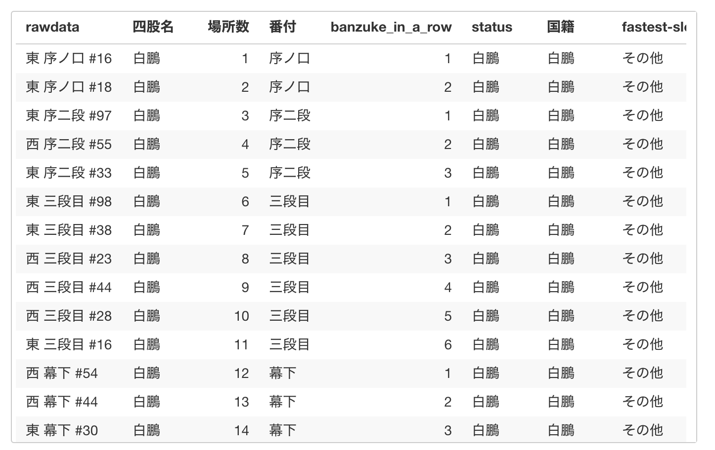 Wikipediaの各力士のページには、それぞれの初土俵から現在まで(もしくは引退まで)の全ての場所の番付と成績が載っています。これをWebスクレイプすることで、昭和の大横綱、千代の富士から、現在の横綱に至るまでの全ての横綱のデータを用意してみました。以下は、そのうちの100行をサンプルしたものです。