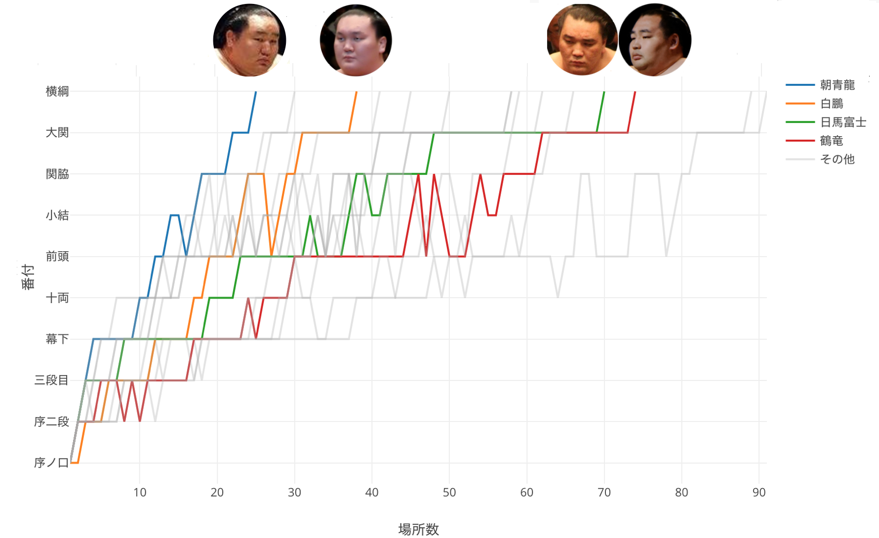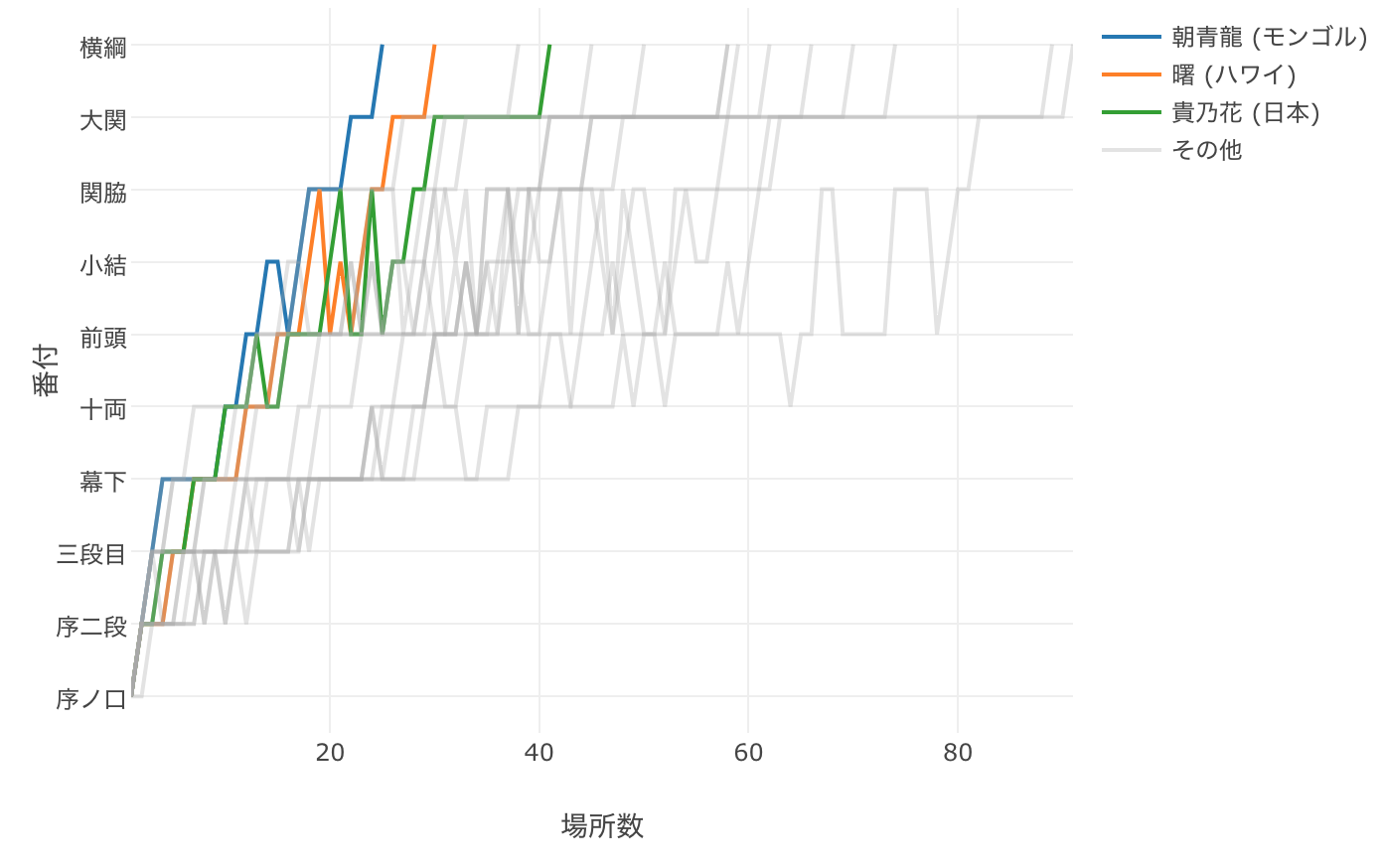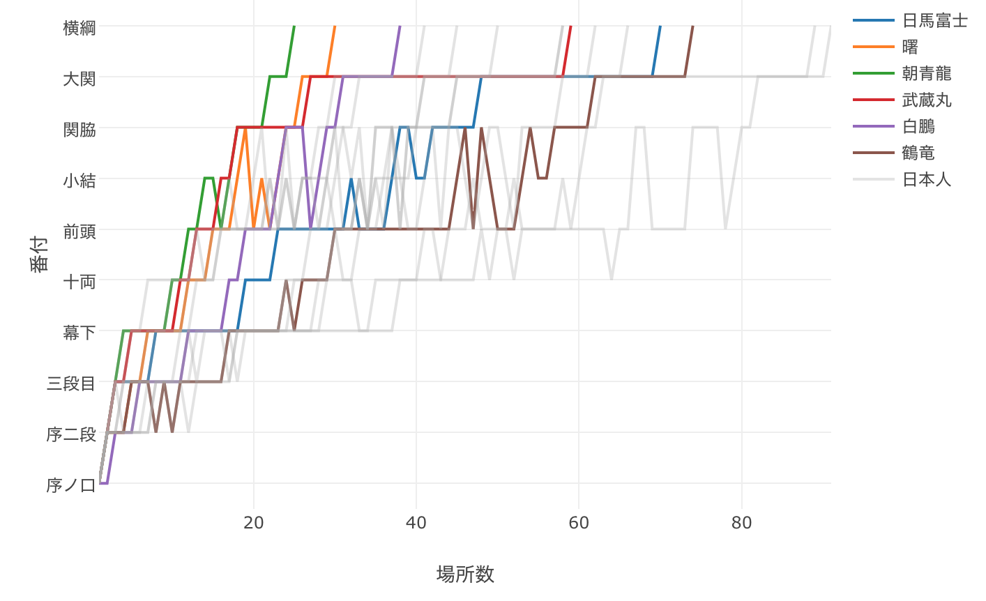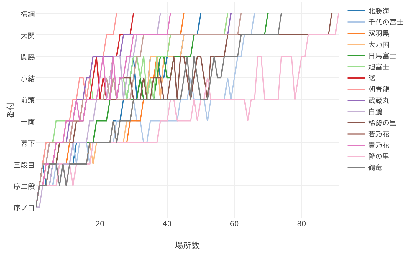 このデータを、それぞれの横綱がどうやって番付を駆け上がっていったのかを以下のように可視化してみました。縦軸が番付で、全ての力士が一番下の序の口からスタートするのですが、徐々に駆け上っていって最後には一番上にある横綱の位置に達するようになっています。横軸はそれぞれの力士が何場所目でそれぞれ該当する番付に到達したのかを表しています。駆け上がっていく線の傾きが急なほど、他の力士に比べて早いスピードで昇進していったことになり、逆に先の傾きがゆるいと遅いということになります。