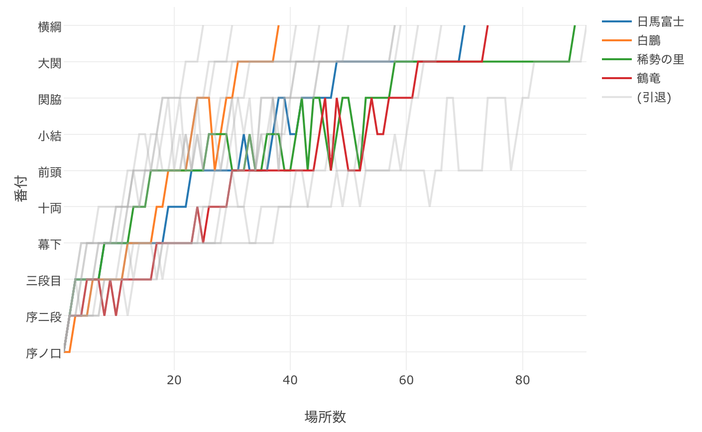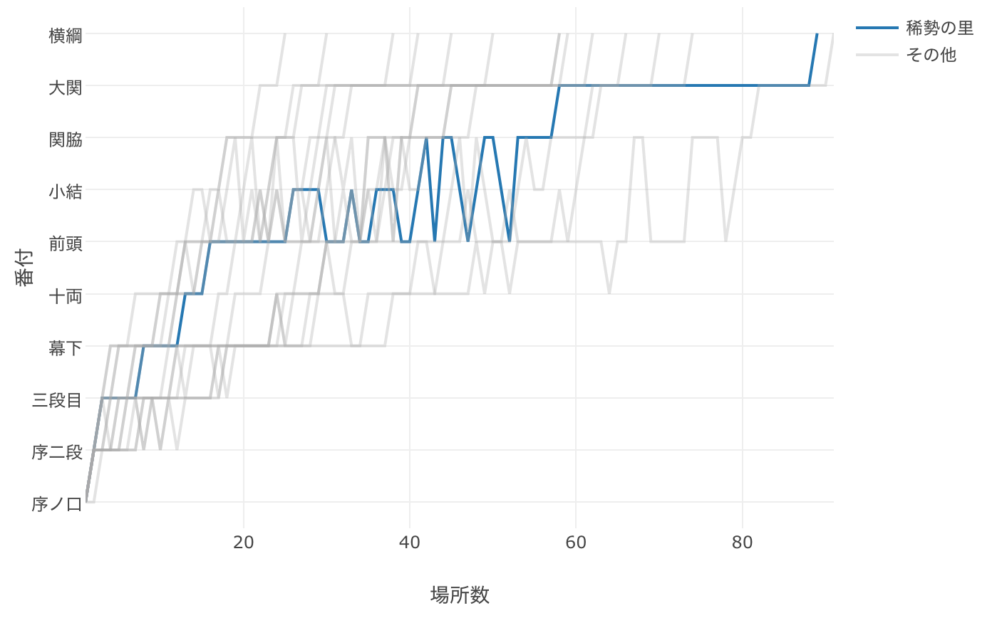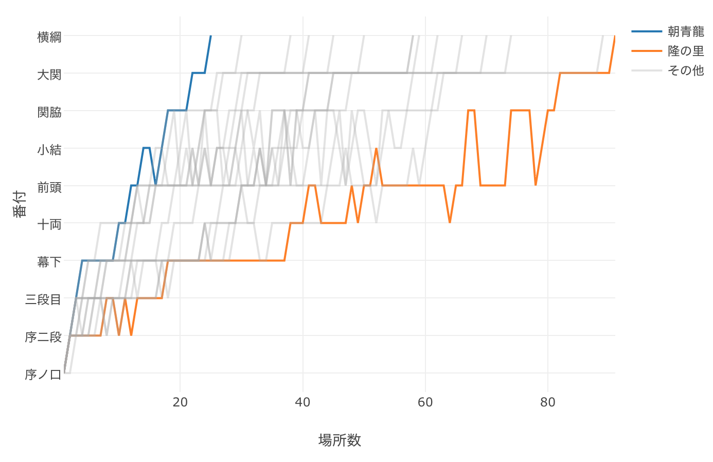 大抵の場合は昇進のステップは上に向いて上がっていくのですが、中には落ちてしまうこともあります。例えば、隆の里(一番右のピンク)の場合は関脇と小結の間を行ったり来たりするのが見えると思います。