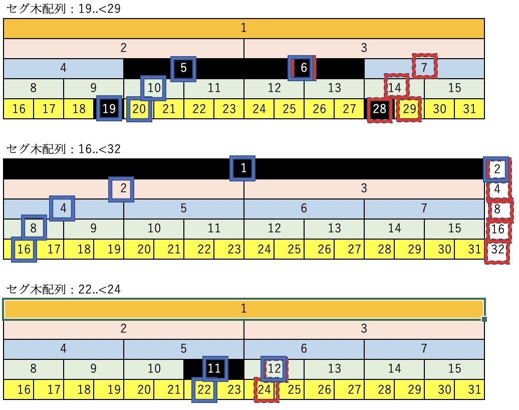 - セグ木は裏では配列を使っていました。過去の投稿で使った図では、区間取得クエリの対象配列は、マス16〜31(以降、対象配列と呼ぶ)に格納されていて、マス1〜15(以降、上部ノードと呼ぶ)には、クエリの内容に応じた数値が入ってました。