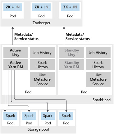 Spark を高可用性にする場合、SparkHead ポッドを複数用意するだけでなく、処理を分散するよう Zookeeper も複数構成とします。Active/Standby 構成となります。