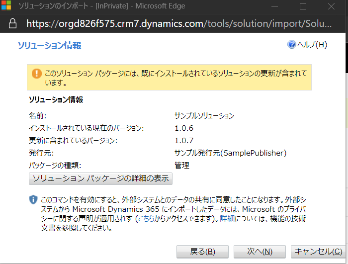 4. https://make.powerapps.com に接続。管理者権限でログイン。すでに SampleSolution を入れた環境で Solutions を選択し、Import をクリック。コンパイルした zip をインポート。インポート時にパッケージが更新される旨が表示されるので、そのまま次へ。