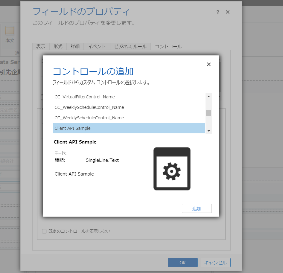 7. 任意の一行テキストフィールドに対してプロパティよりコントロールを選択し、開発したコントロールを追加。