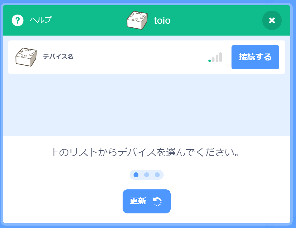- toio™️ core cubeが接続できていると、この表示になります。接続が切れた場合は切れた状態アイコンになるのでクリックして再接続ができます。