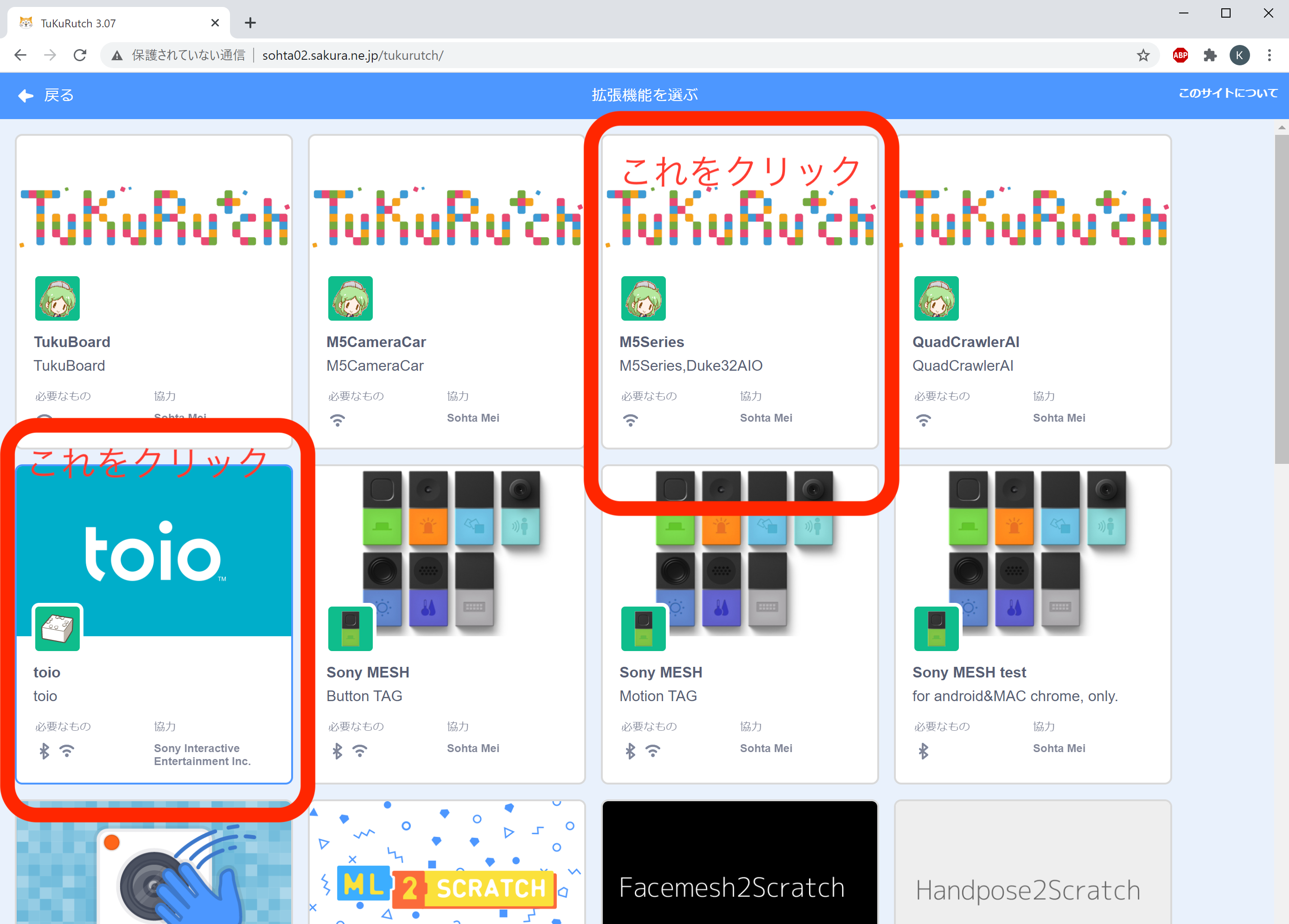 - 拡張機能から、「M5Series」と「toio」をクリックして追加