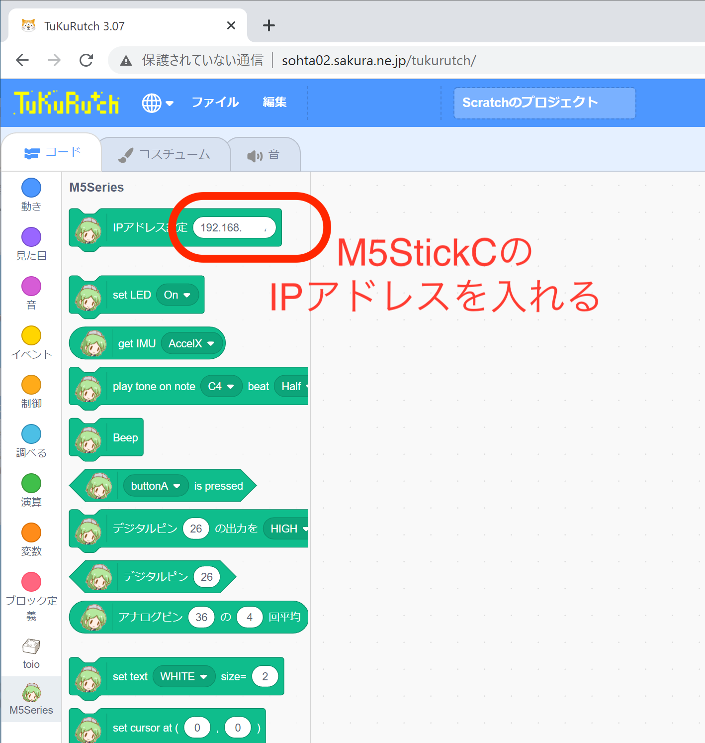 - 左端の機能ブロック選択で「M5Series」をクリックし、「IPアドレス設定」ブロックにM5StickCのLCD画面に表示されているIPアドレスを入力します。