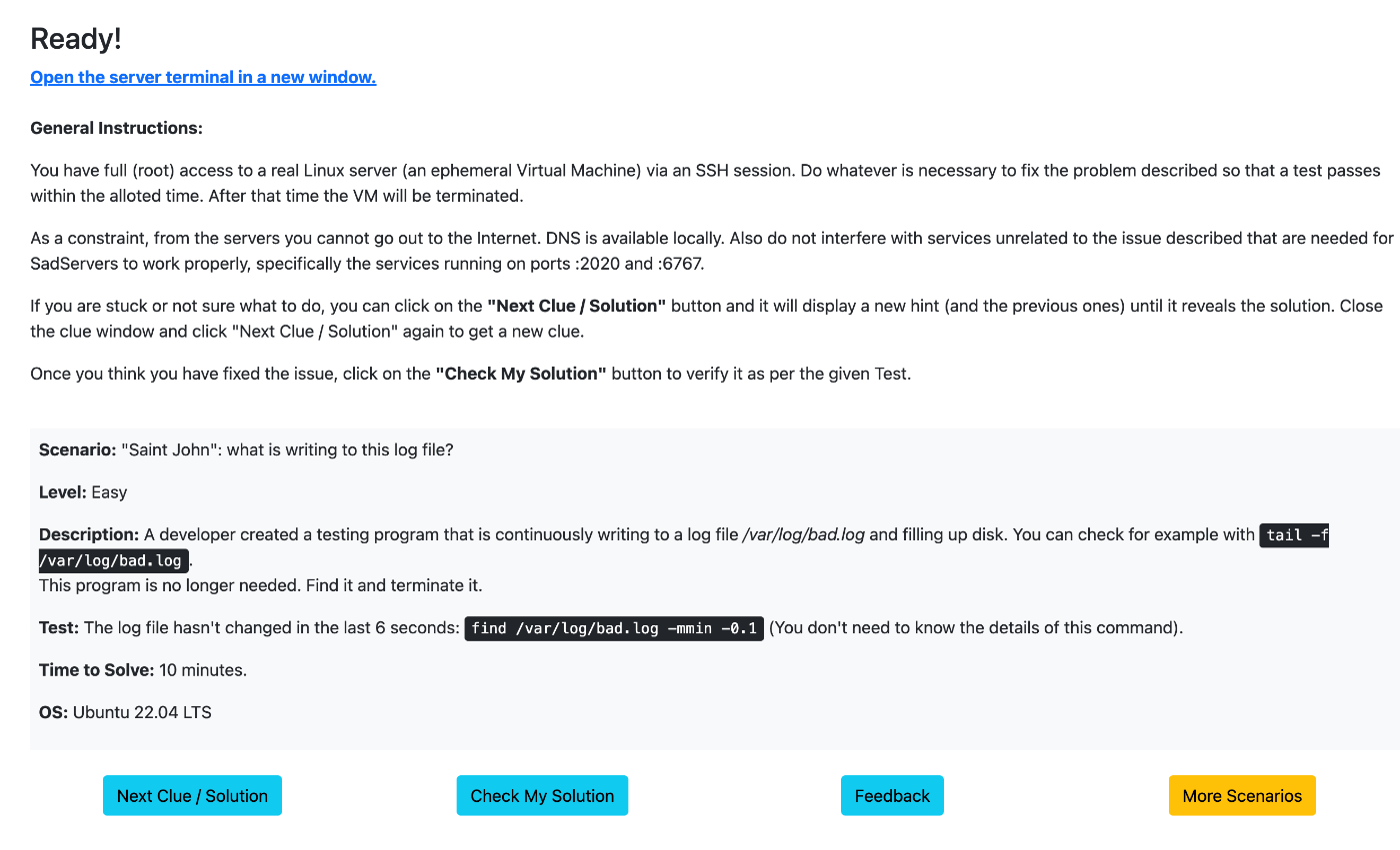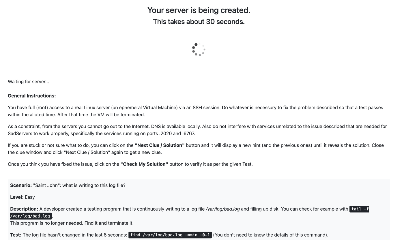 SadServers とは "Like LeetCode for Linux" と あるように、 Linuxサーバ管理者向けの LeetCode のようなサイトで、Linuxサーバで発生する様々な問題に対して、その解決を行います。