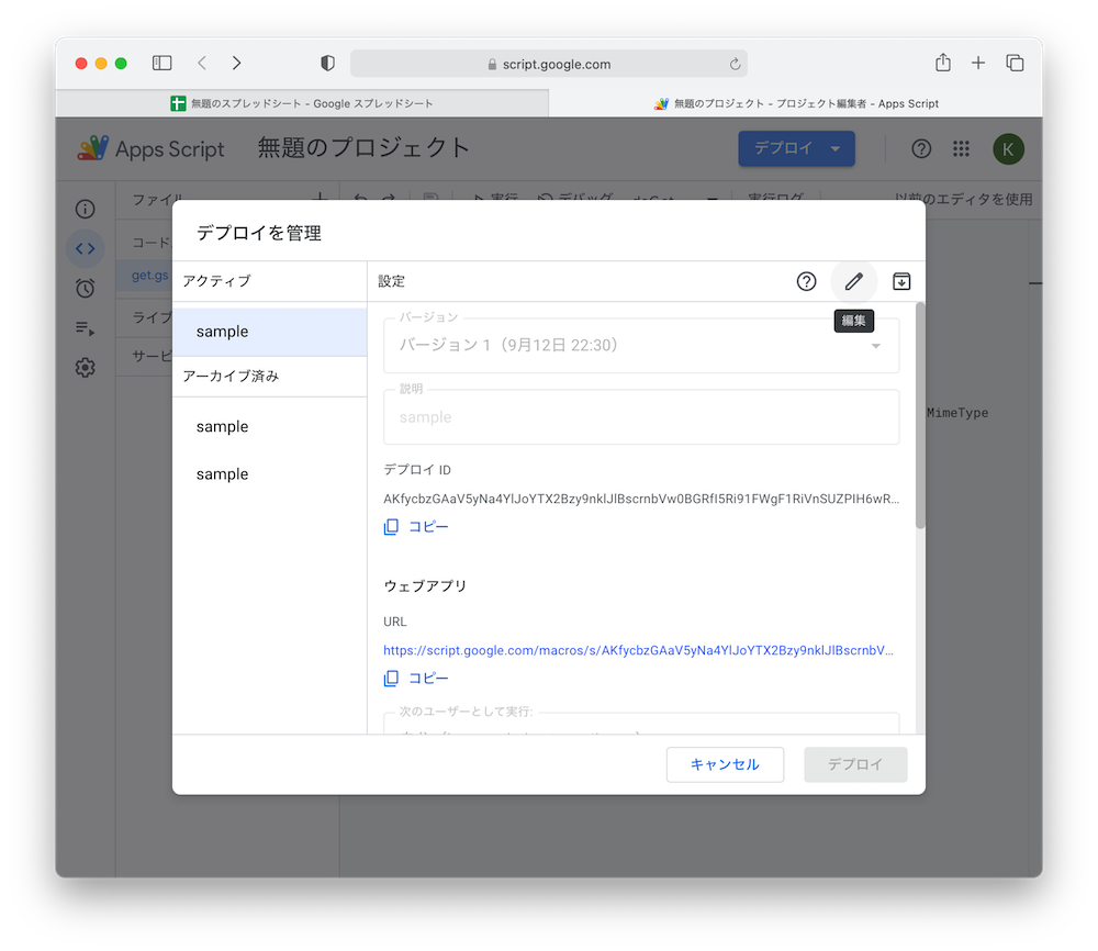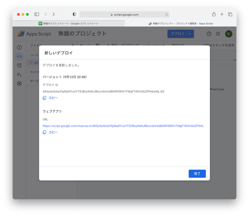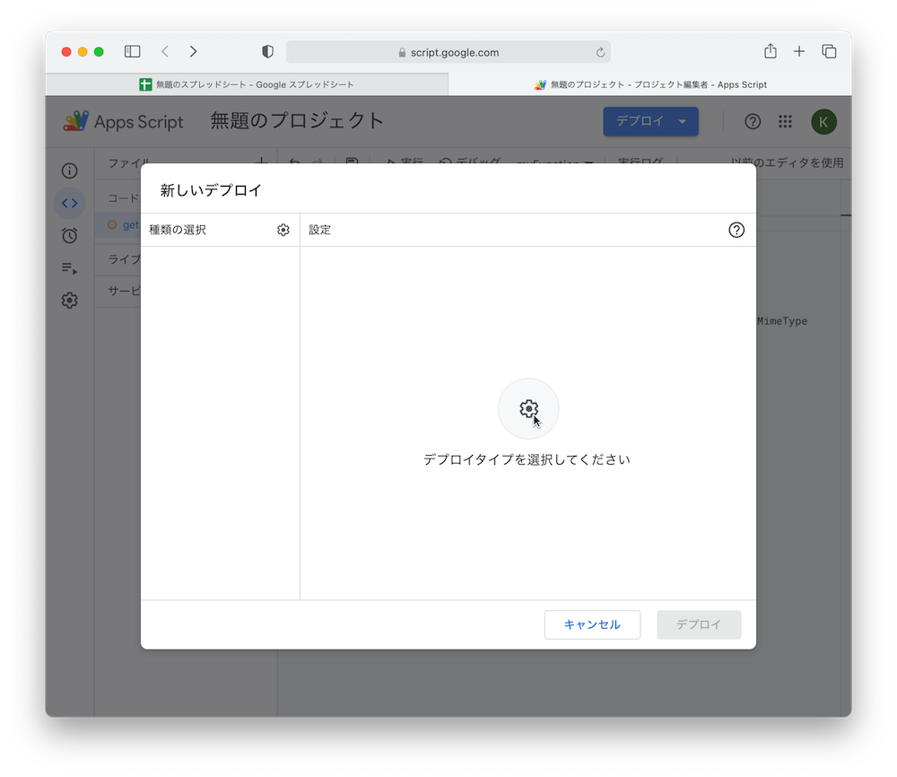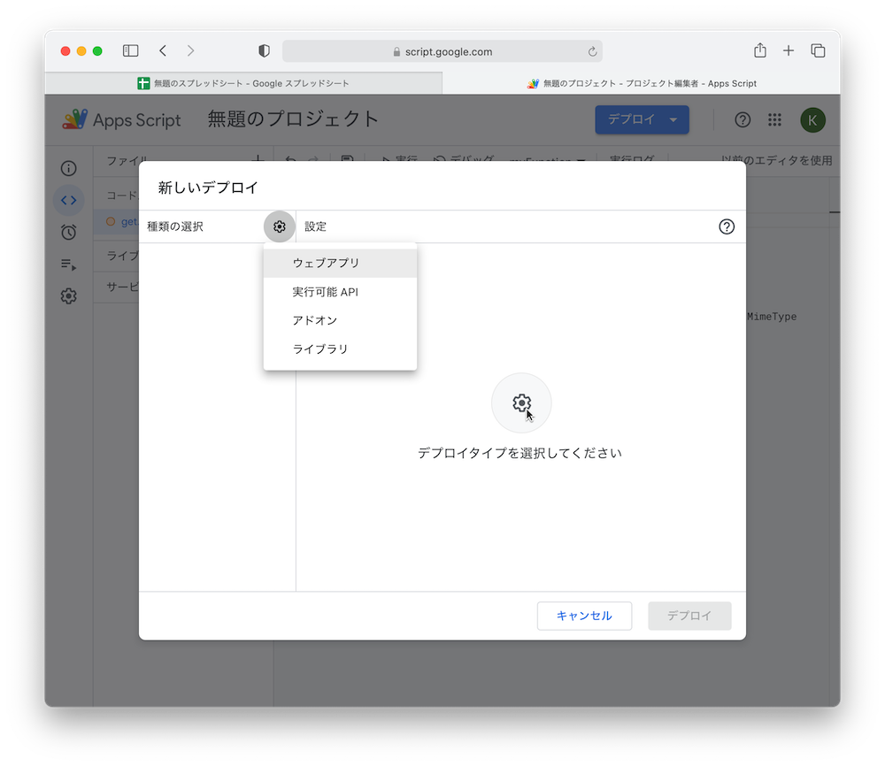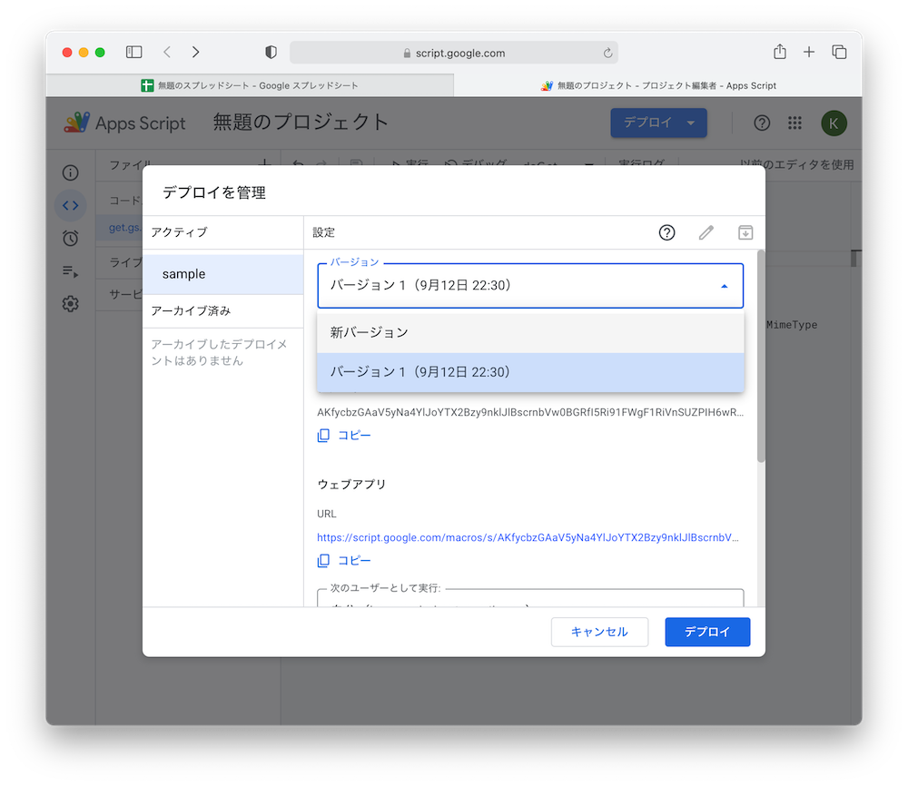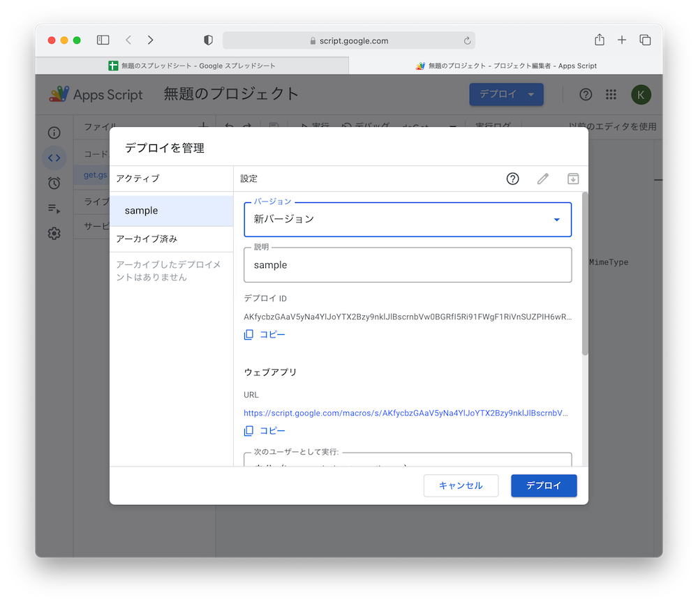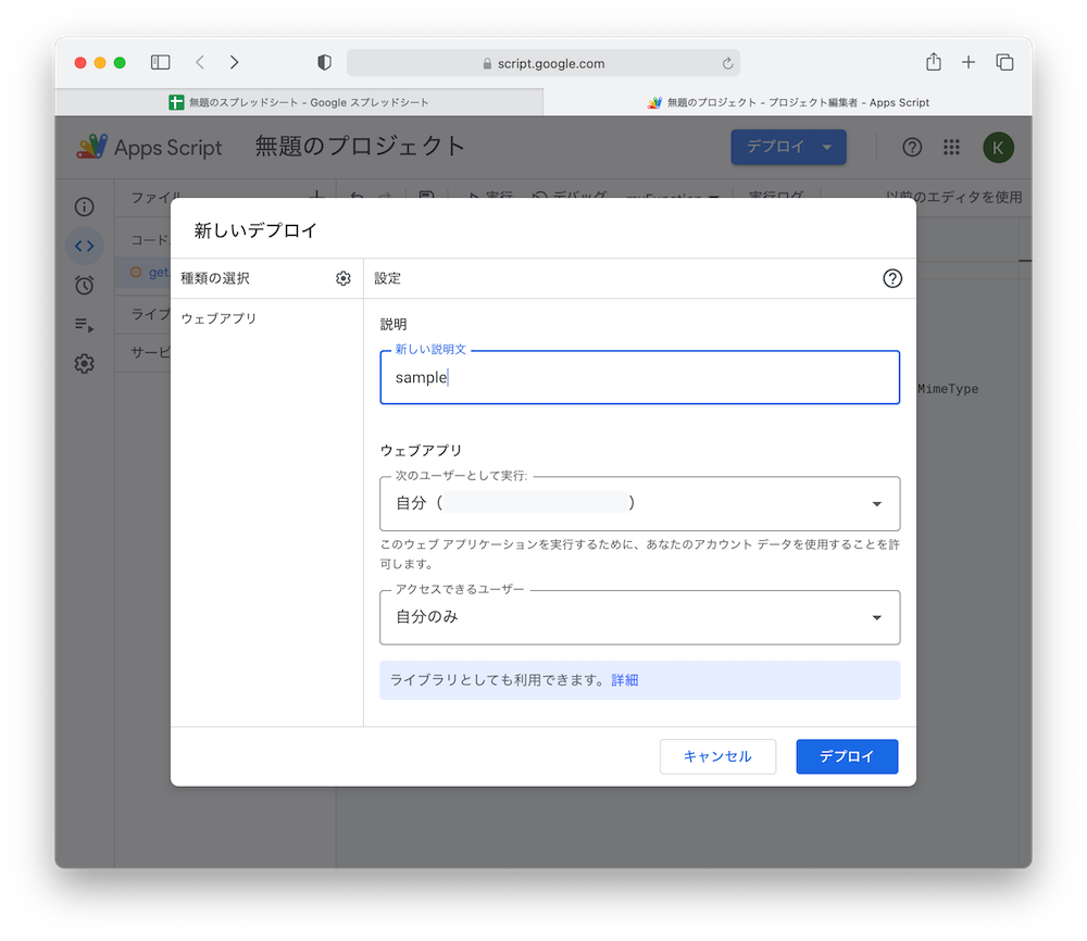 を実装し、デプロイ>新しいデプロイ
