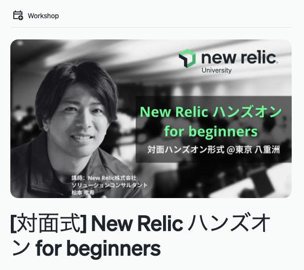 ちなみに、[対面式] New Relic ハンズオン for beginnersに参加してもらうと、今回お伝えした内容を含んだ網羅的な使い方を短時間で体験できるよ。