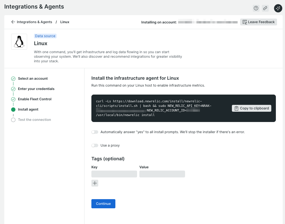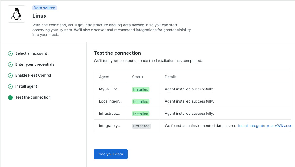 ログイン後、UIの左側にあるメニューからIntegrations & Agentsをクリックして、Linuxを検索するよ。