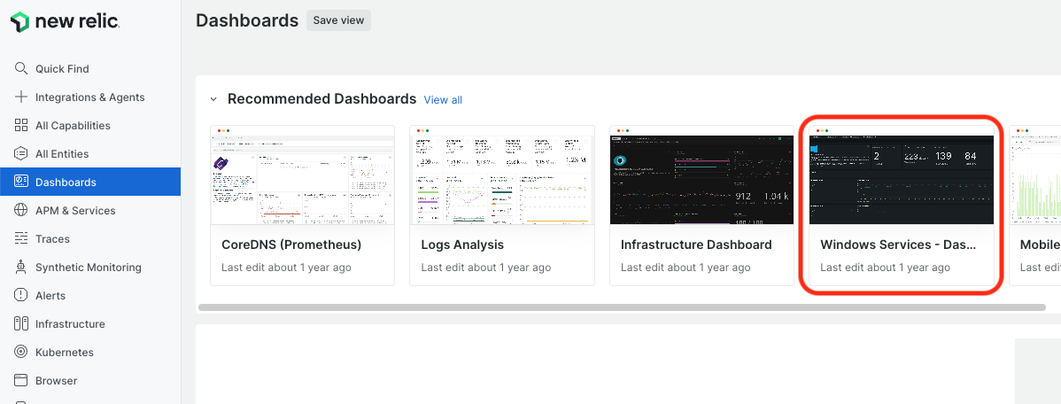 New RelicポータルのDashboardsメニューを選択して、Windows Services - Dashboardをクリックするよ