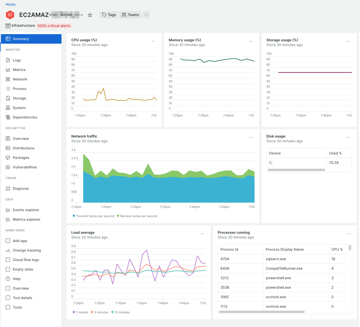 インストール後に、New RelicポータルのAll EntitiesメニューのHostsセクションに対象サーバが表示されればインストール完了だよ。そのサーバをクリックして、こんなUIが確認できたら、ちゃんとデータが収取されているよ