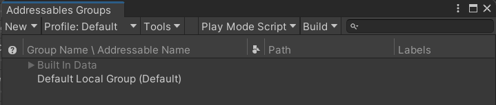 Addressables GroupsウィンドウのBuildボタンを押して、new Build / Default Scriptを選択します